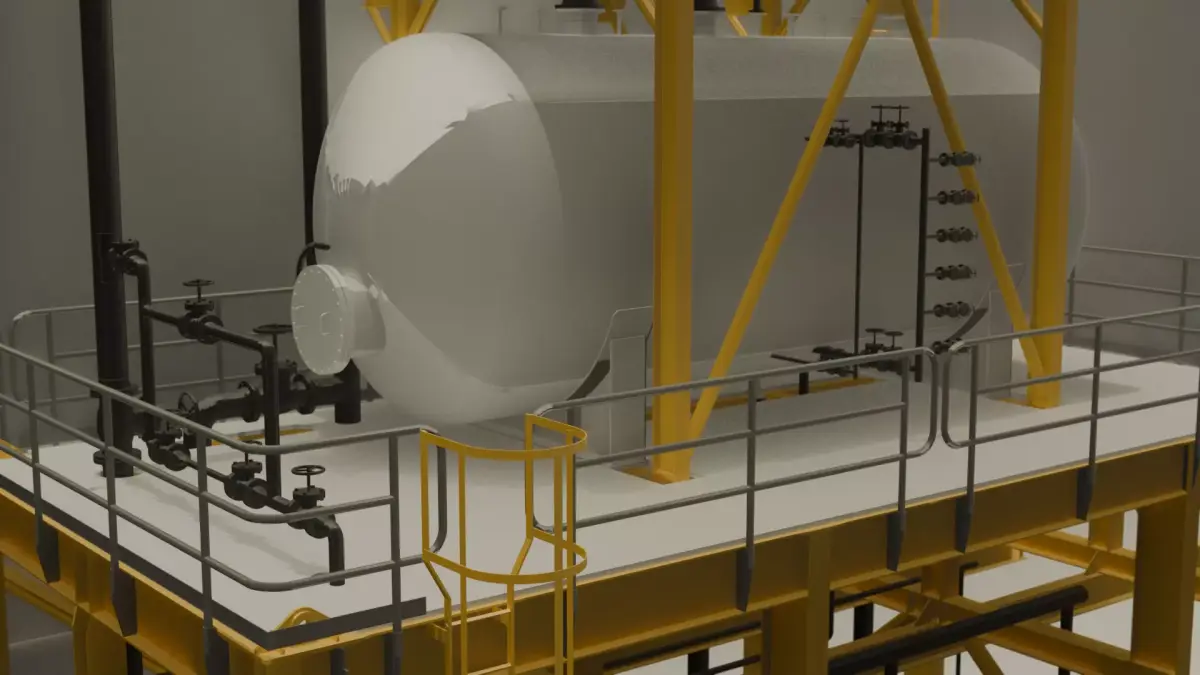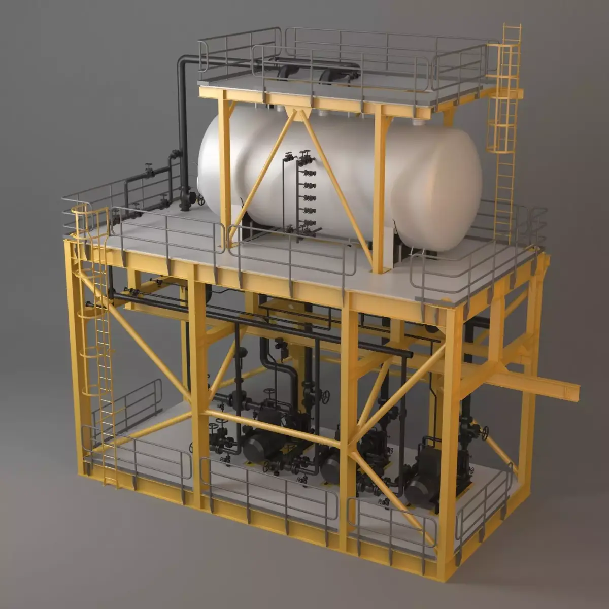 The model accurately represents a typical setup, including a large storage tank (or chiller), supporting steel structure (skid), intricate piping network, pumps, valves, and full access platforms/railings.