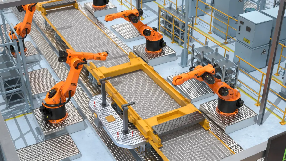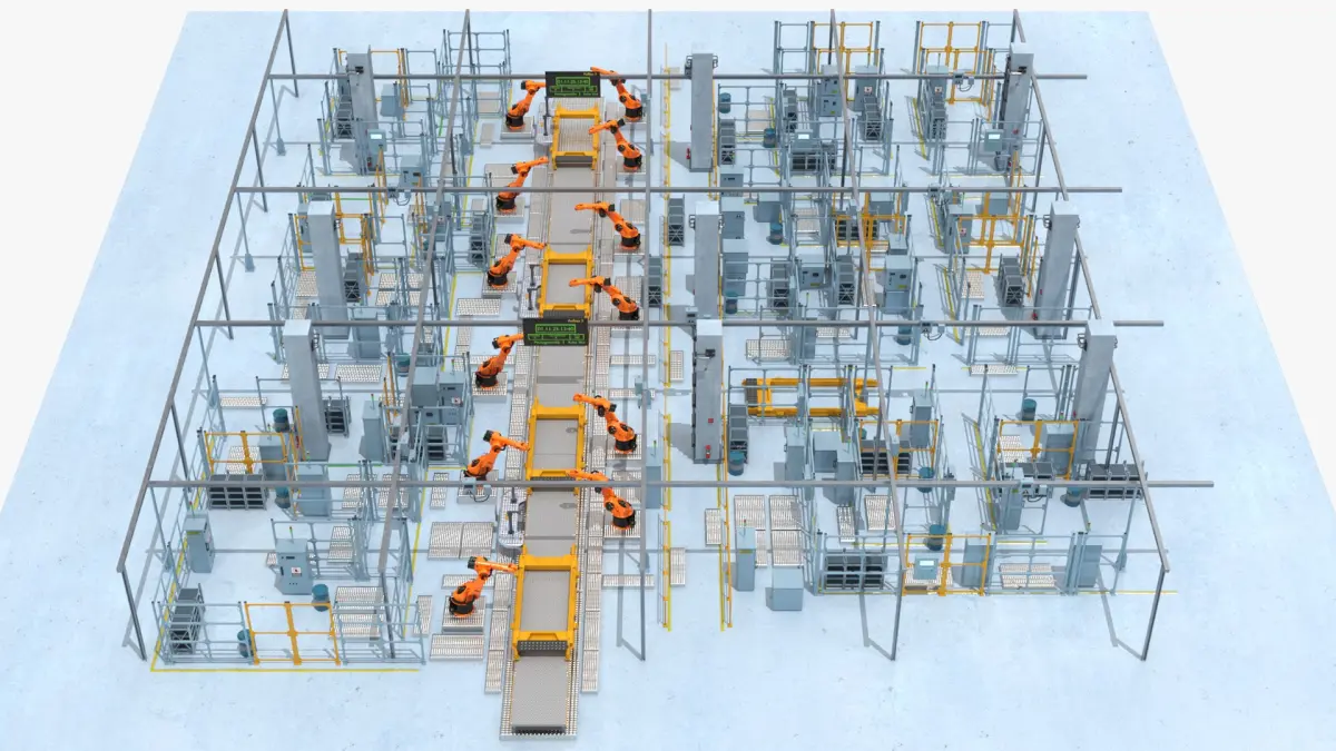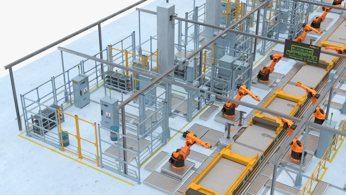 The model showcases a detailed assembly line layout, complete with articulated robotic arms for handling materials and automated processes. The environment is designed to illustrate the integration of machinery, safety barriers, and digital interfaces, providing a realistic representation of modern industrial automation.