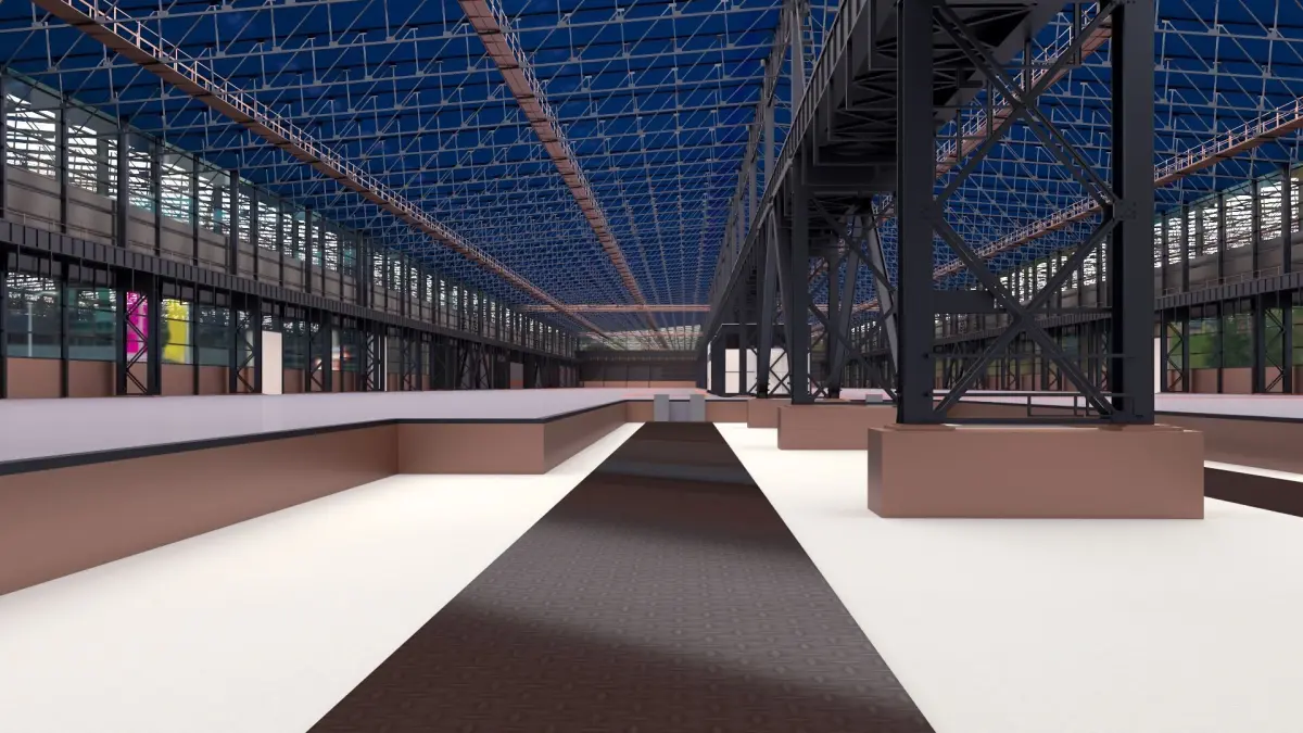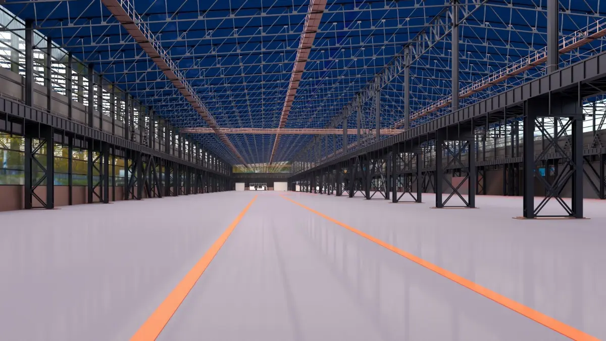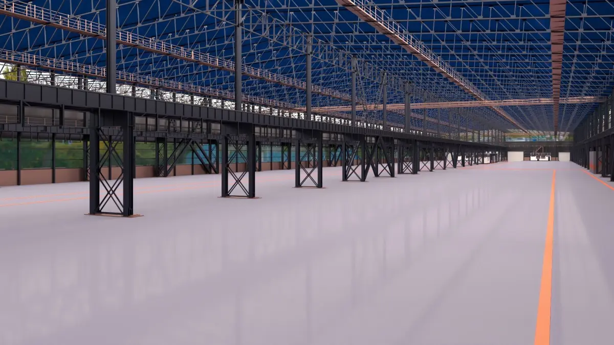 This industrial warehouse, covering several thousand square meters, has been meticulously designed with a high level of detail. All interior and exterior features have been accurately modeled—even down to the bolts connecting the columns—to represent reality as closely as possible.
