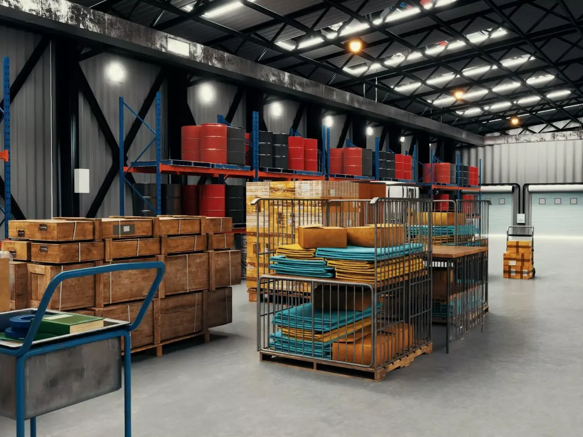 Professional high-quality 3D complete scene of an Industrial Warehouse and Logistics Distribution Center meticulously crafted for large-scale manufacturing visualization smart logistics planning and supply chain simulation projects. This massive environment features a comprehensive storage layout including heavy-duty steel truss roofing industrial chemical drums stacked palletized cargo logistics sorting robots manual handling carts and professional high-bay lighting systems with realistic PBR materials.