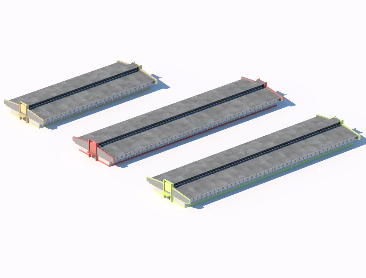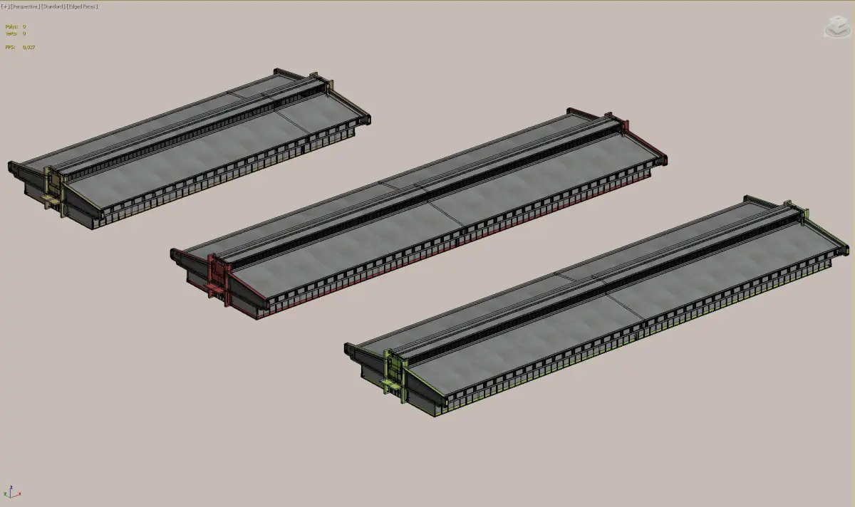 A 3D model of industrial warehouse structures with colorful accents, perfect for logistics and industrial scene visualizations.