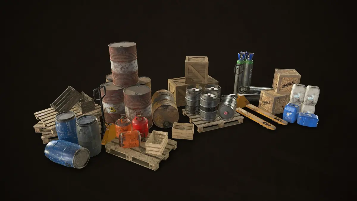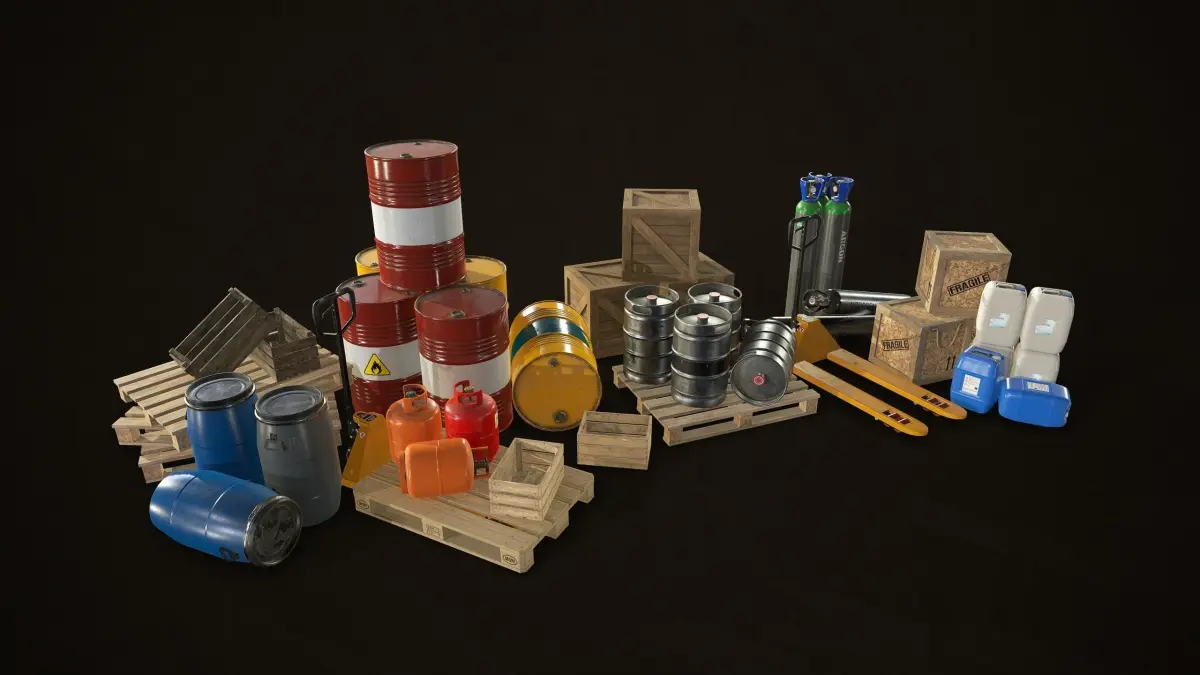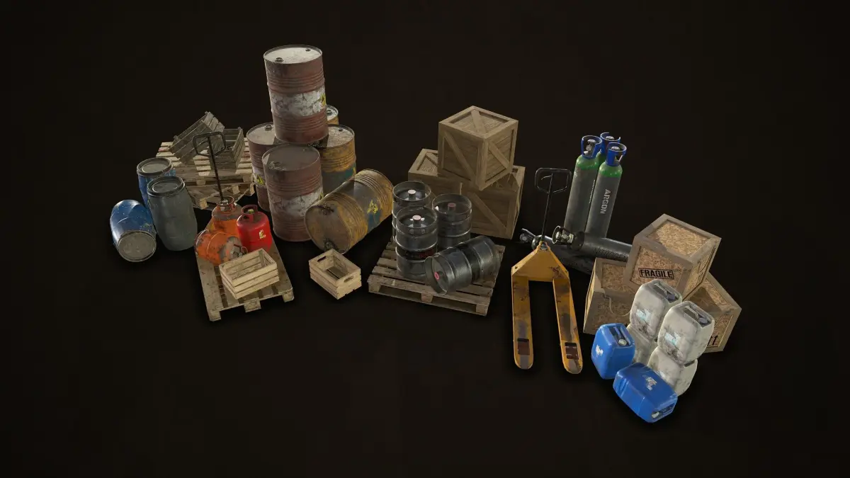 Low Poly pack of game ready industrial warehouse props with PBR textures: