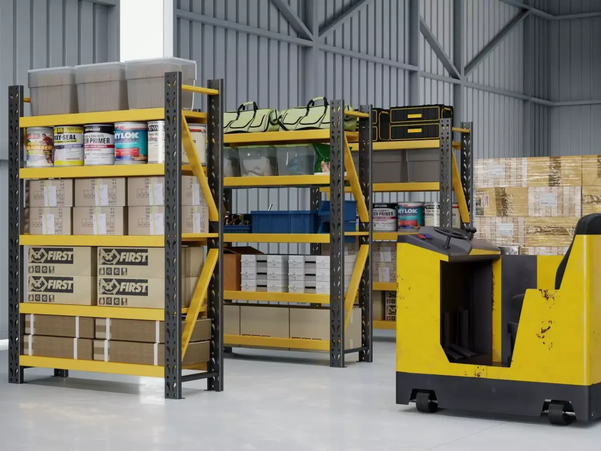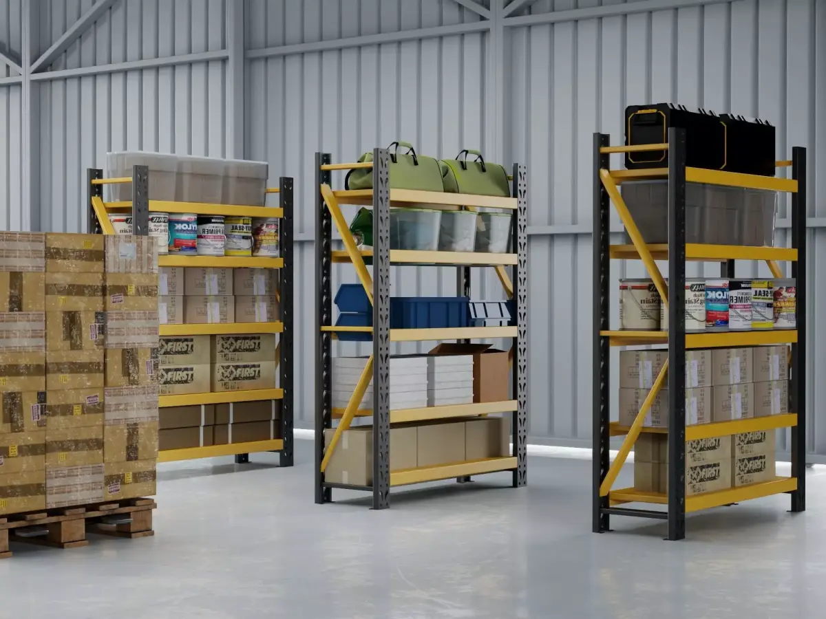 A realistic industrial warehouse storage shelving set designed for logistics, factory, and warehouse environments.