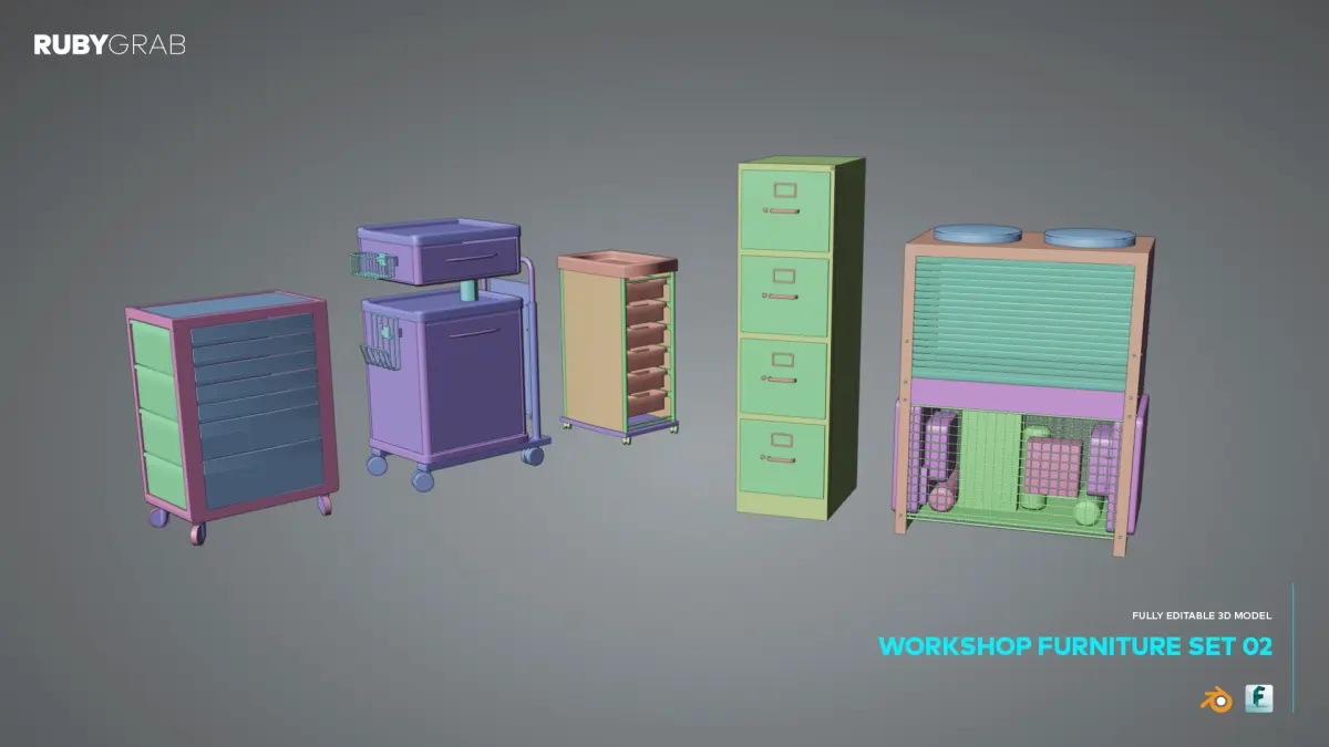 This is a high-quality, fully editable 3D model set of modern workshop furniture. The pack includes six detailed models such as mobile tool cabinets, storage units, filing drawers, and ventilation equipment, all designed with precision for professional or industrial settings.