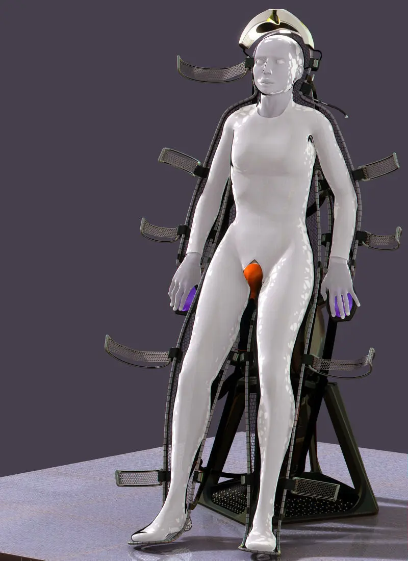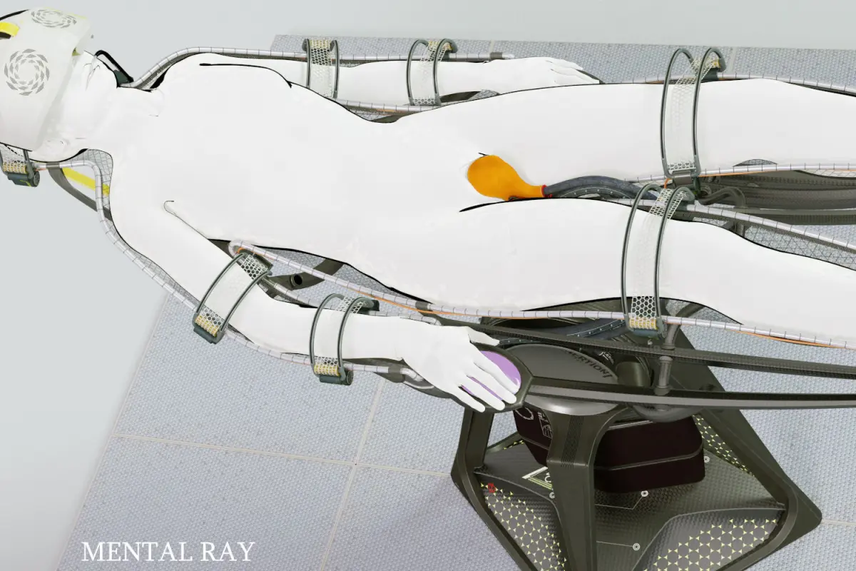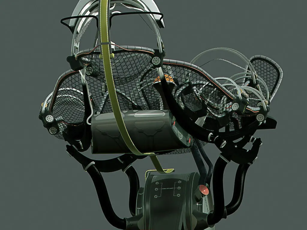 Two versions provided: Mental Ray with Arch & Design and Scanline with standard Max materials. A mannequin is included. The model poly count given is for the unsubdivided hammock only.Model is animated with bracelet unlocking and a skinned visor cable.Model has diffuse, specular and bump mapping. HDR used for reflections. Model is adapted for realtime graphics, all textures power of two, standard Max materials used. Rendered in Scanline mode, model will render as seen in previews. Lense effects added in Photoshop.Layered PSD maps included for customisation.