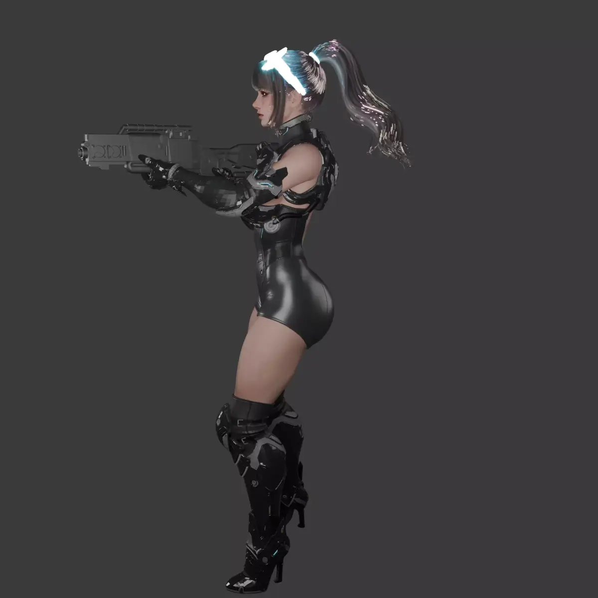 A futuristic female warrior dressed in a sleek black cybernetic bodysuit, combining elegance and power. Her glowing headband and high-tech armor pieces highlight her advanced combat readiness. She wields a sci-fi firearm with precision, exuding confidence and determination. The overall aesthetic merges cyberpunk style with tactical sophistication, enhanced by the soft glow of neon accents against the dark setting.