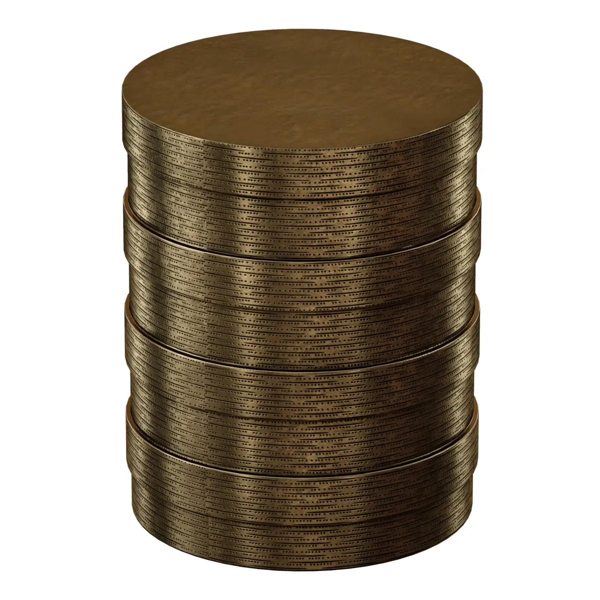Seller Description:OverviewThis drum-shaped end table rounds out the room with global echoes. Cast aluminum shapes its channel-chiseled profile textured from top to bottom with dots and dashes. A rich antiqued brass finish further enriches the table's depth and texture. The textured buffed and lacquered warm bronze finish. Lightweight yet sturdy, the table is just the right size to cozy up to a sofa or chair.Overall DimensionsWidth: 13.75 Depth: 13.75 Height: 17 "