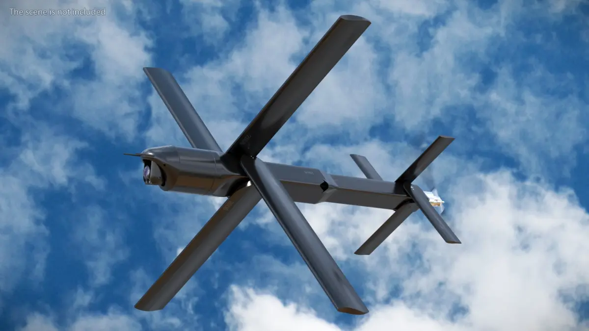 Infantry Drone Launch Weapon with UAV In Flight Black Rigged for Maya is a 3d model of a versatile unmanned aerial vehicle designed for reconnaissance and tactical applications.