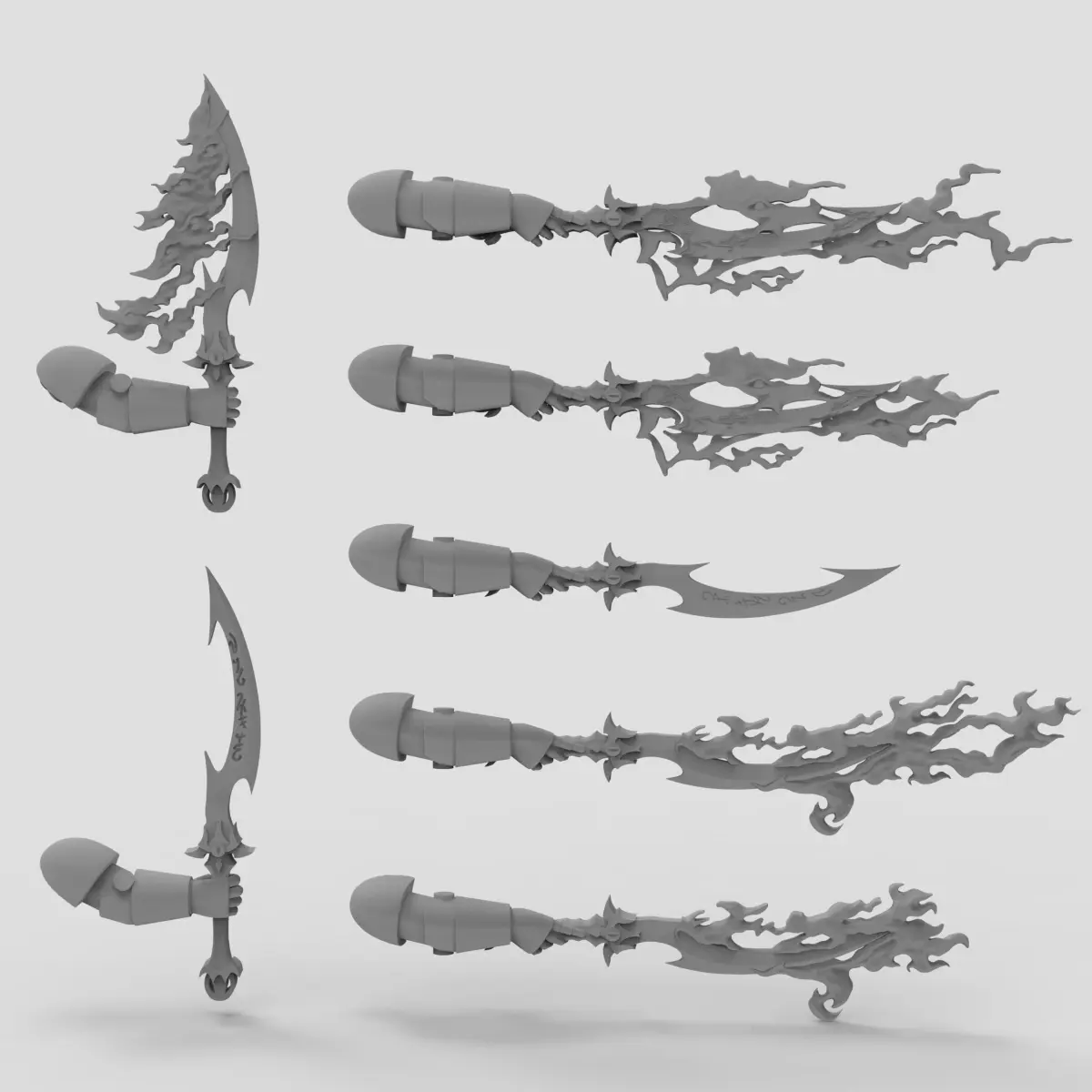It is a now-forgotten dream of a proper mutation cult melee bomb sorcerer for dusty bois, but here's a couple of flaming khopeshes for you anyway. Use them to give the dogs of the false emperor a proper slashy welcome! Or just make an upgrade to your Khenetai with flames!