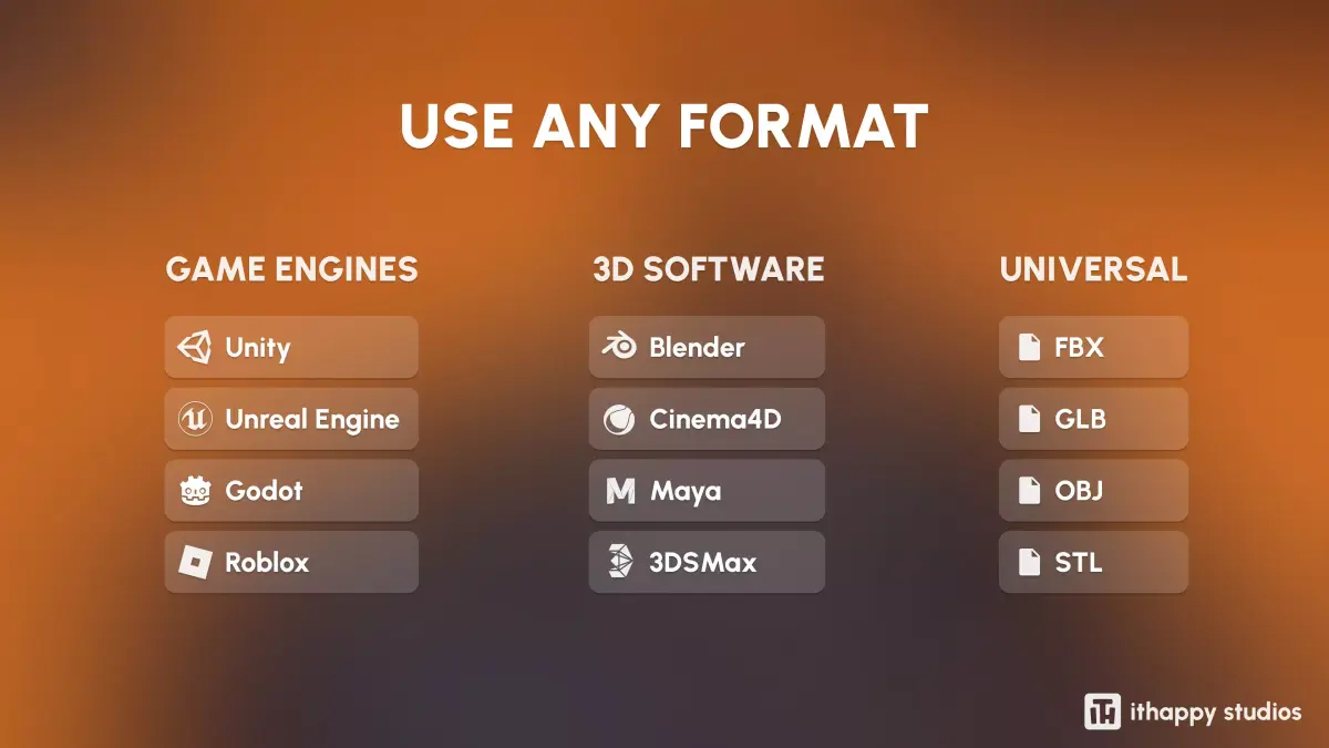 FILESYou’ll be able to download formats such as Unity Package, UE, Blender, C4D, Maya, 3DSMax, FBX, OBJ, GLTF, and STL.