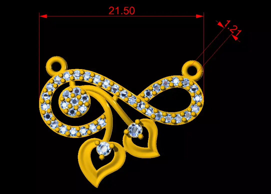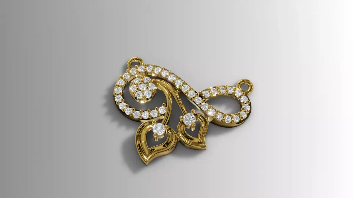 The pendant’s smooth infinity curves are complemented by two leaf-inspired elements at the bottom, creating a balanced and luxurious aesthetic. Designed for gold casting and diamond setting, this piece is ideal for fine jewelry production.