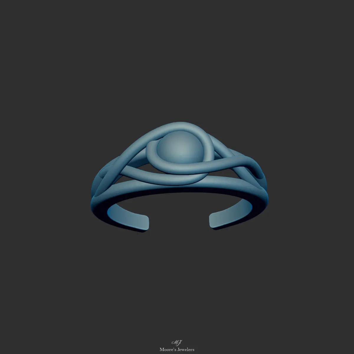 At the center or the ring is a 5mm round ball that is held in place by the curves of the shank. The ring gets the infinity naming because, while wearing the ring, it appears as if the shank is never ending. Looping around and feeding back into itself.