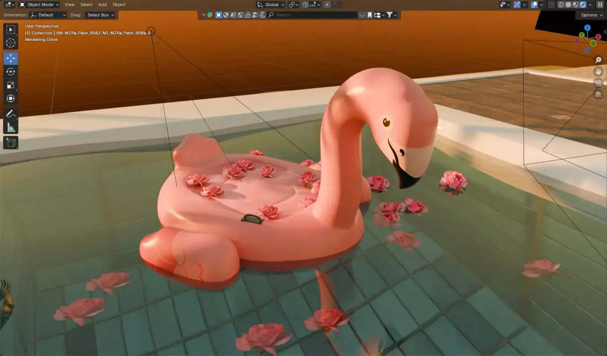 3D design of a pink flamingo pool float, created in a 3D environment. The left side showcases the final realistic render with smooth, glossy materials, while the right side displays the wireframe model, revealing the geometric structure of the design. The combination of both views highlights the balance between the artistic and technical aspects of the work.