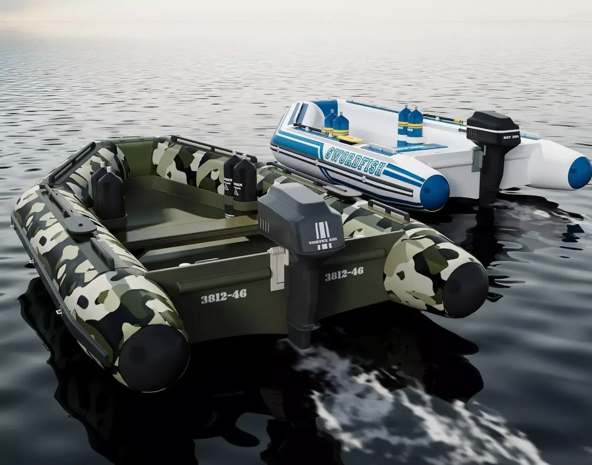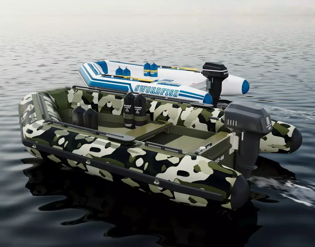 This high-quality inflatable motor boat 3D model pack includes two detailed variations: a camo military-style inflatable boat and a blue-white “Swordfish” inflatable dinghy. Both boats are equipped with realistic outboard engines, detailed seams, and accurate inflatable structures, making them ideal for marine visualization, simulation projects, rescue scenarios, fishing scenes, and diving concepts.
