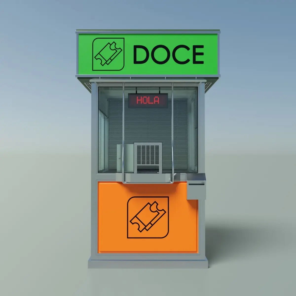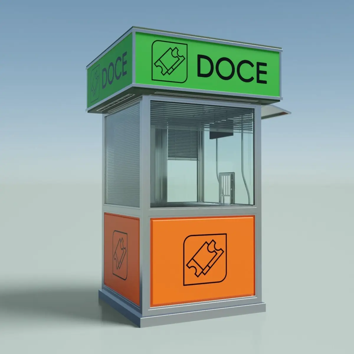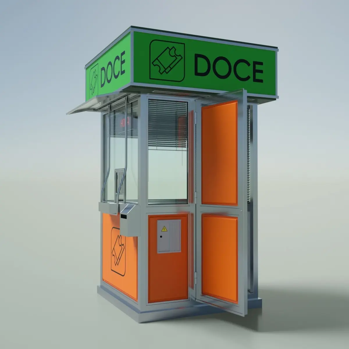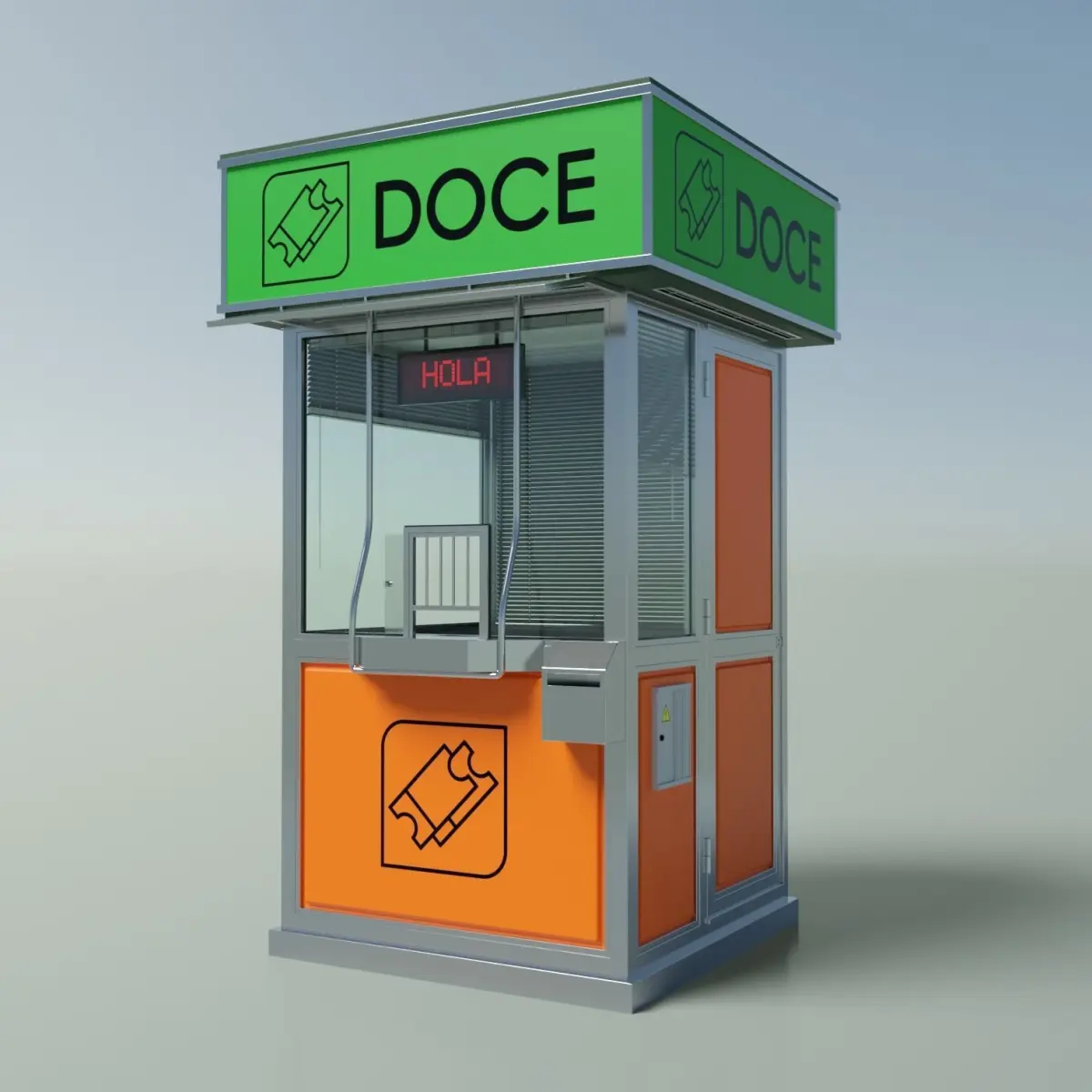 Information point, tickets kiosk, access control, lottery stand, etc. Street cabin made of glass and metal with panelsYou can open the door and the tickets window. Led sign with texture. Paper bin. Electricity box. All polygonal modelingVenetian blinds in different openings. (Small window all down is hidden, use the outliner to show it if you need)