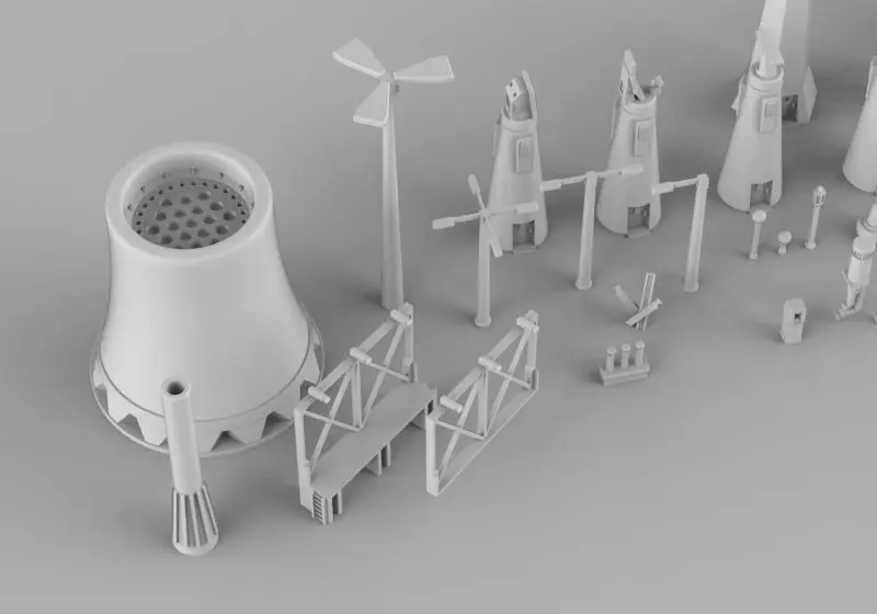 This 94 piece model pack contains various chimney bits, street lamps, coastal radar installations, lighthouses, roadblocks, large billboards, construction and port cranes, spaceframe structures, telecommunication antennas, computer terminals, various breakers, piping, ventilation equipment, power generators, catwalks, ladders, high voltage power grid equipment, cargo and trash containers, silos, water towers, carjacks, purification equipment, large coils, various hatches, and refinery boilers. Made for modern, interwar and sci-fi industrial, coastal and urban settings. Perfect for applying on paper/cardboard and plastic buildings and sceneries. Suitable for various dioramas and gaming boards/tables.