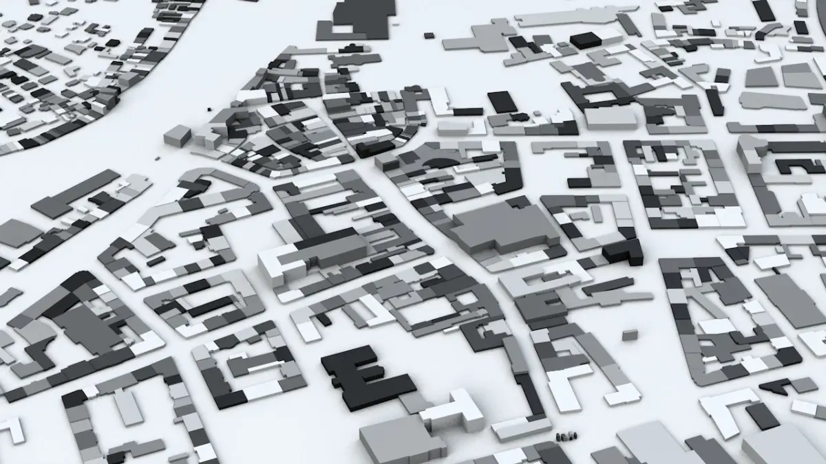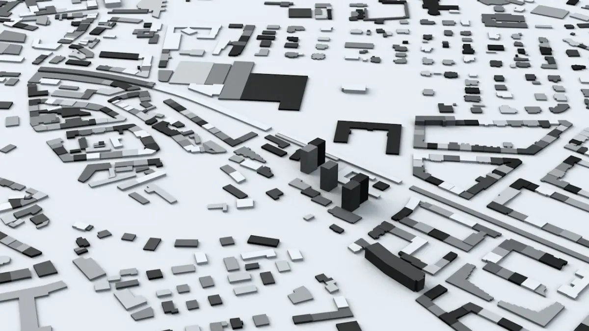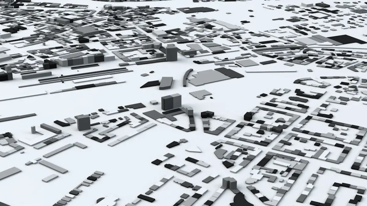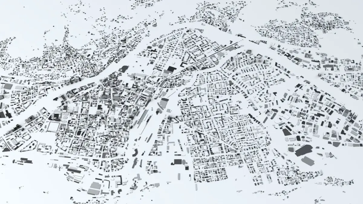 - the model is positioned on a flat surface (all buildings are on the “floor” - no elevation data included)
