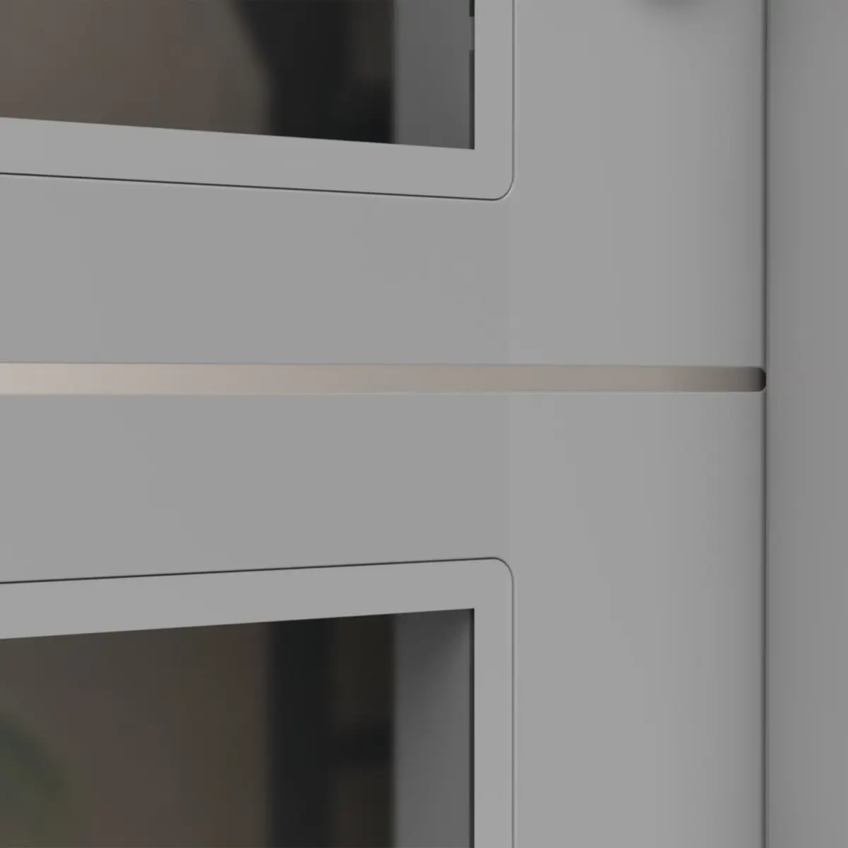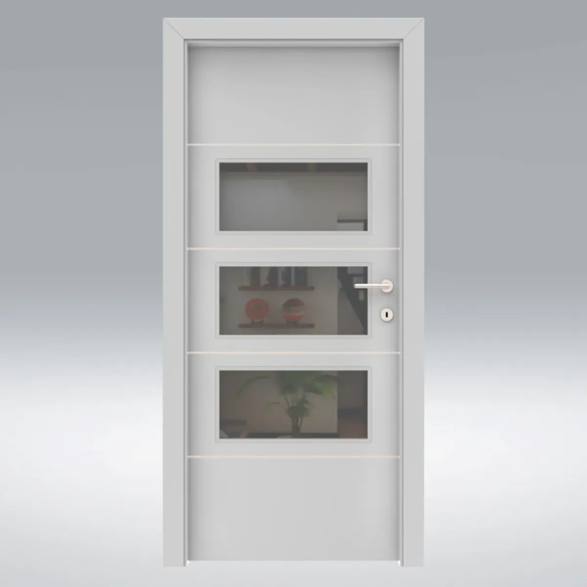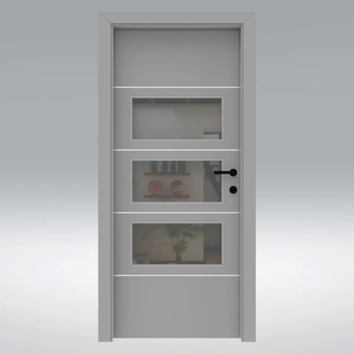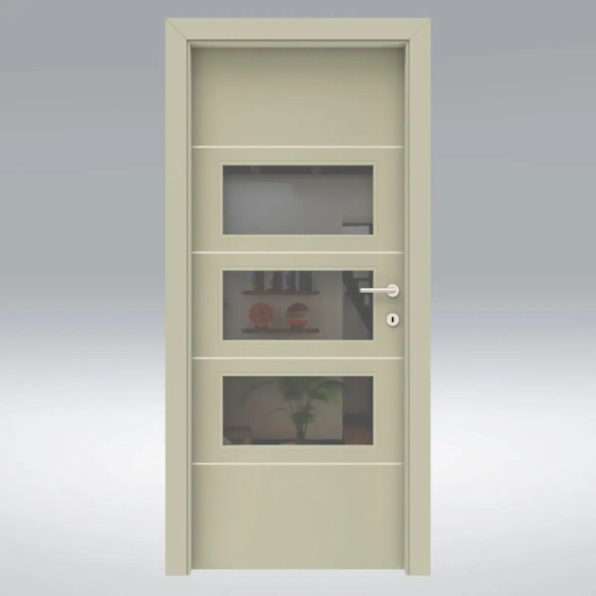 The perfect combination of luxury and Strength.Comes Assembled or in parts. Door have 3 glass matted or frosted panels with 4 inox lines as decoration.Materials: wood, inox, matted glass, painted glass, MDF and aluminium.