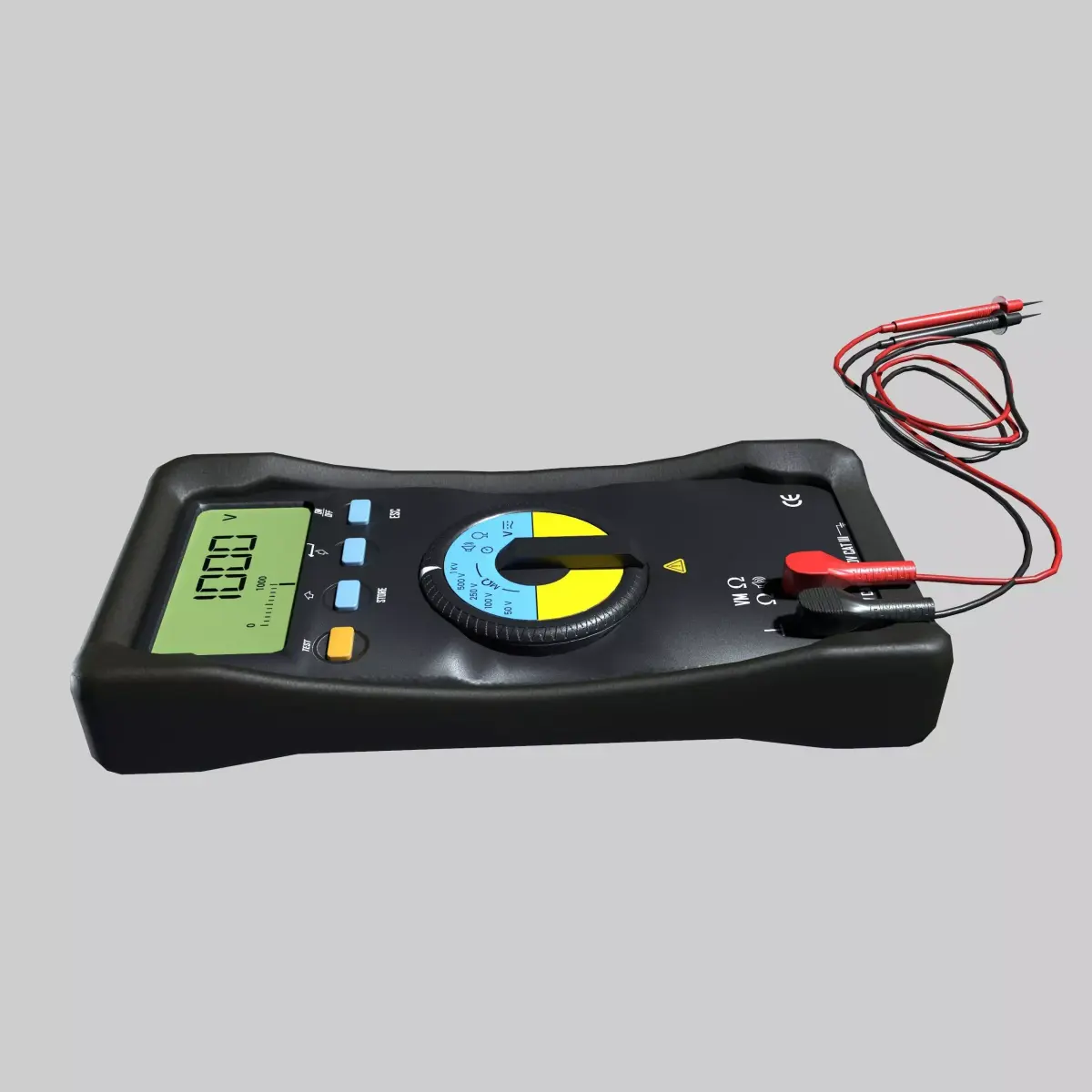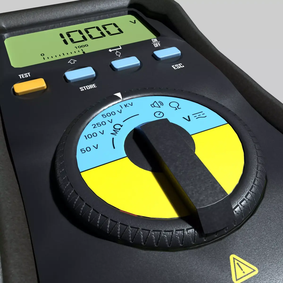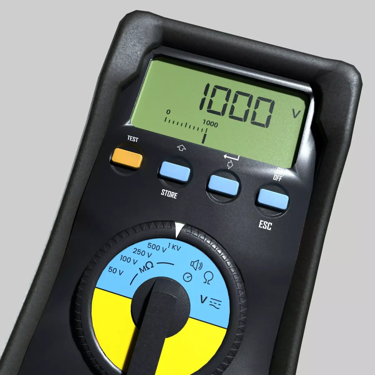 A highly detailed Insulation Tester / Digital Megger 3D model designed for electrical training simulations, VR/AR learning modules, and industrial visualization.The model includes realistic buttons, a functional rotary selector, LCD display, probe wires, and precise labeling—accurately replicating the real tool used for insulation resistance testing.