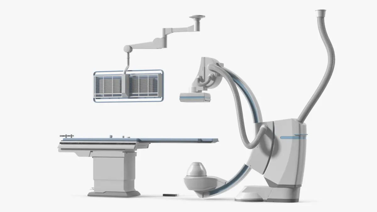Integrated X-Ray Imaging System with Table and Overhead Screens White is a 3d model of an advanced cardiac catheterization laboratory setup, commonly used in medical facilities for interventional cardiology procedures.