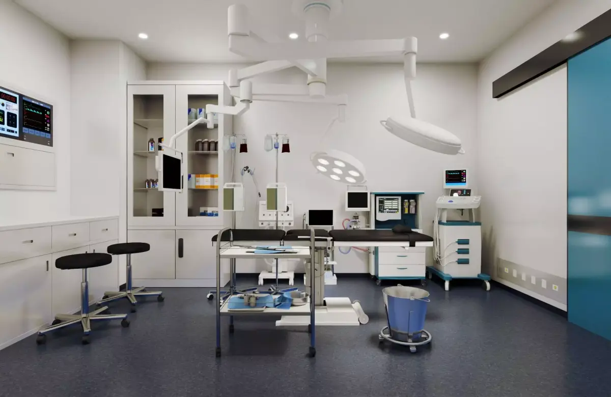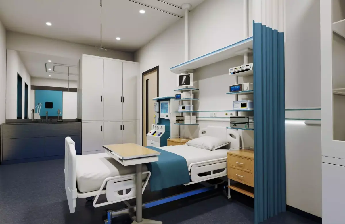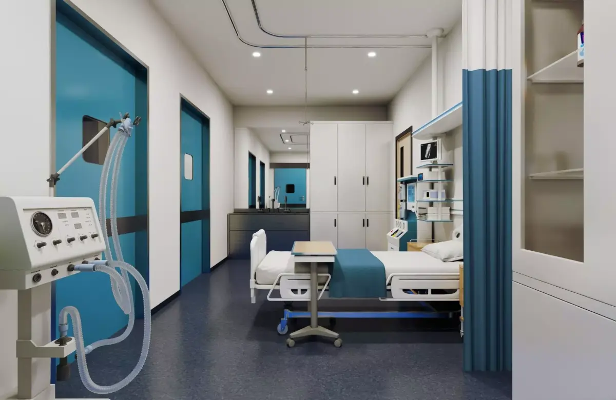 This immersive 3D model depicts a modern intensive care unit (ICU) hospital room, complete with an adjustable patient bed featuring blue bedding, an overbed tray table, a mechanical ventilator with attached tubing and monitoring dials, privacy curtains on ceiling tracks, built-in wall cabinets and shelves stocked with medical supplies, and blue-accented doors leading to a hallway with additional rooms. The design includes functional elements like recessed lighting, medical gas outlets, and a clean, sterile environment with dark blue flooring and neutral walls for a realistic healthcare setting. Ideal for medical training simulations, architectural visualizations, virtual reality hospital tours, or game development. Optimized with high-quality textures for equipment, fabrics, metals, and surfaces. File formats: OBJ, FBX, Blender.