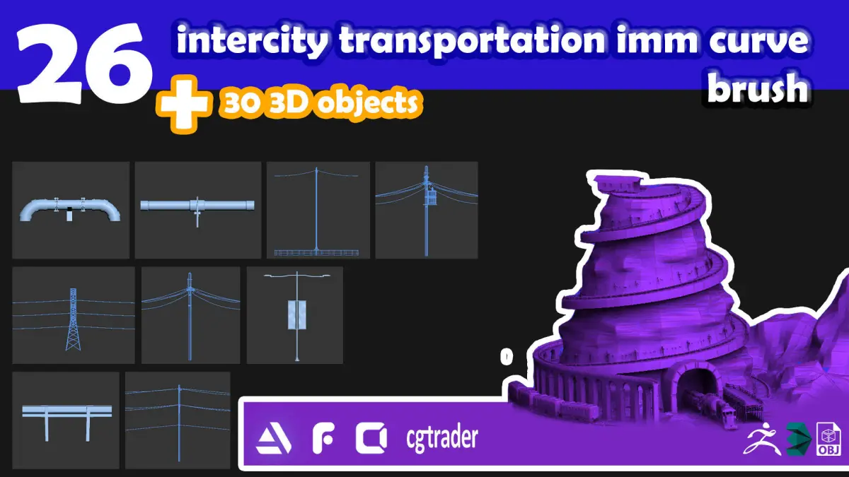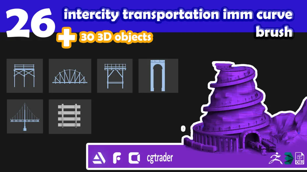 there is 26 im curved brush and 30 3d objects related to intercity transportation systems and objects.