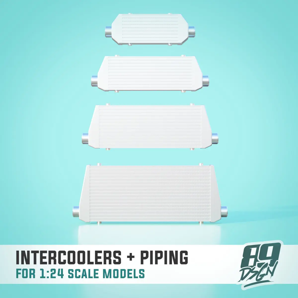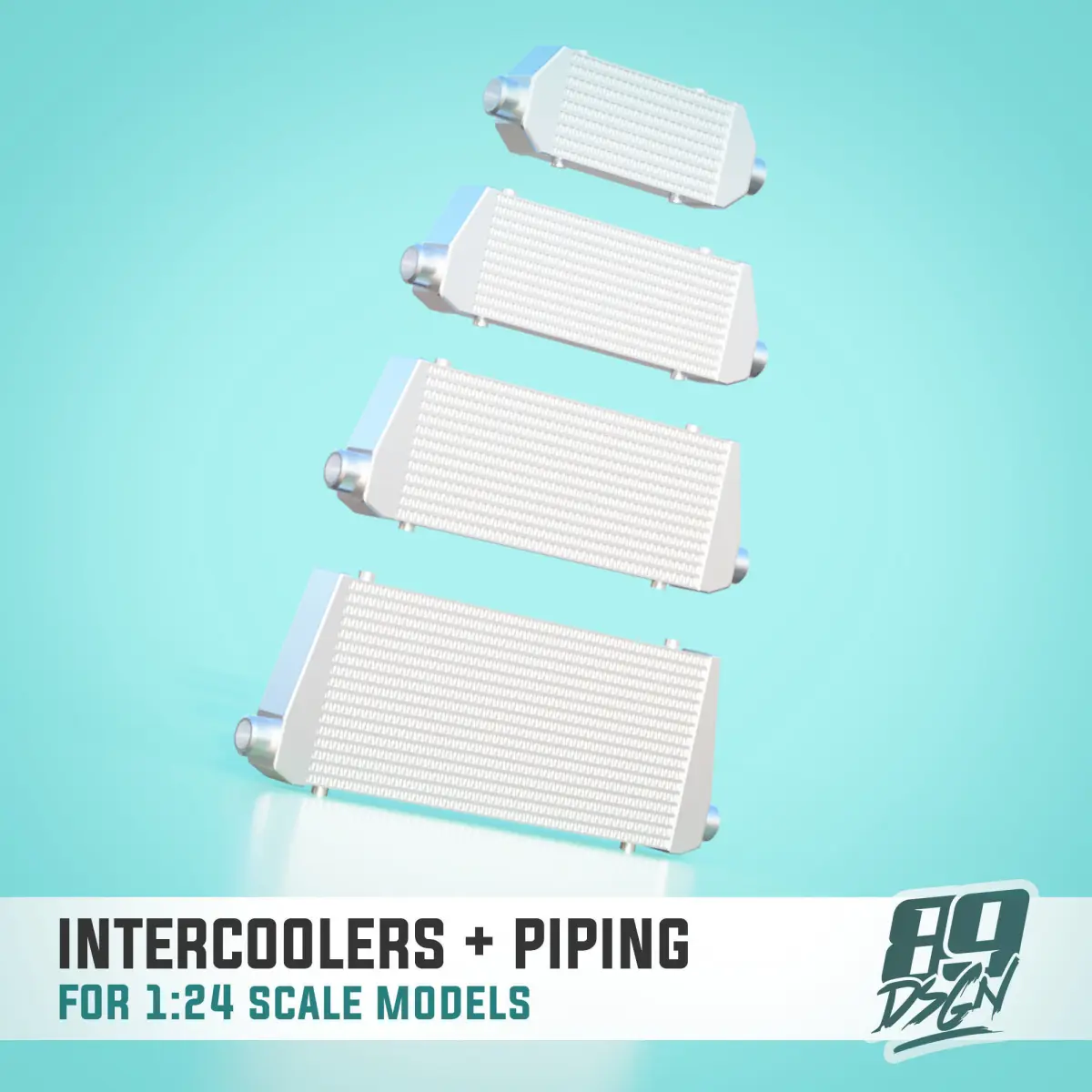A set of four intercoolers in various sizes and accessories for the intake system. Designed in 1:24 scale
