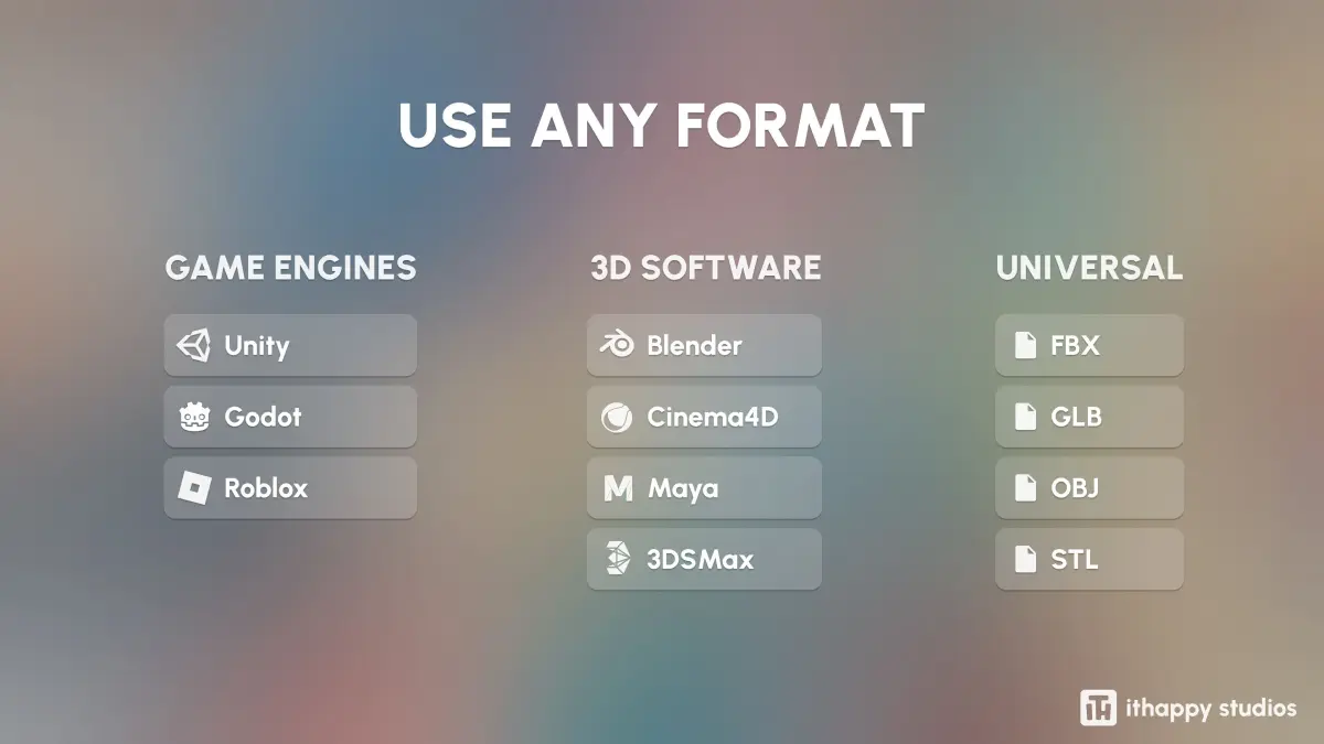 CHECK OUT OTHER PACKSFILESYou’ll be able to download formats such as Unity Package, UE, Blender, C4D, Maya, 3DSMax, FBX, OBJ, GLTF, and STL.