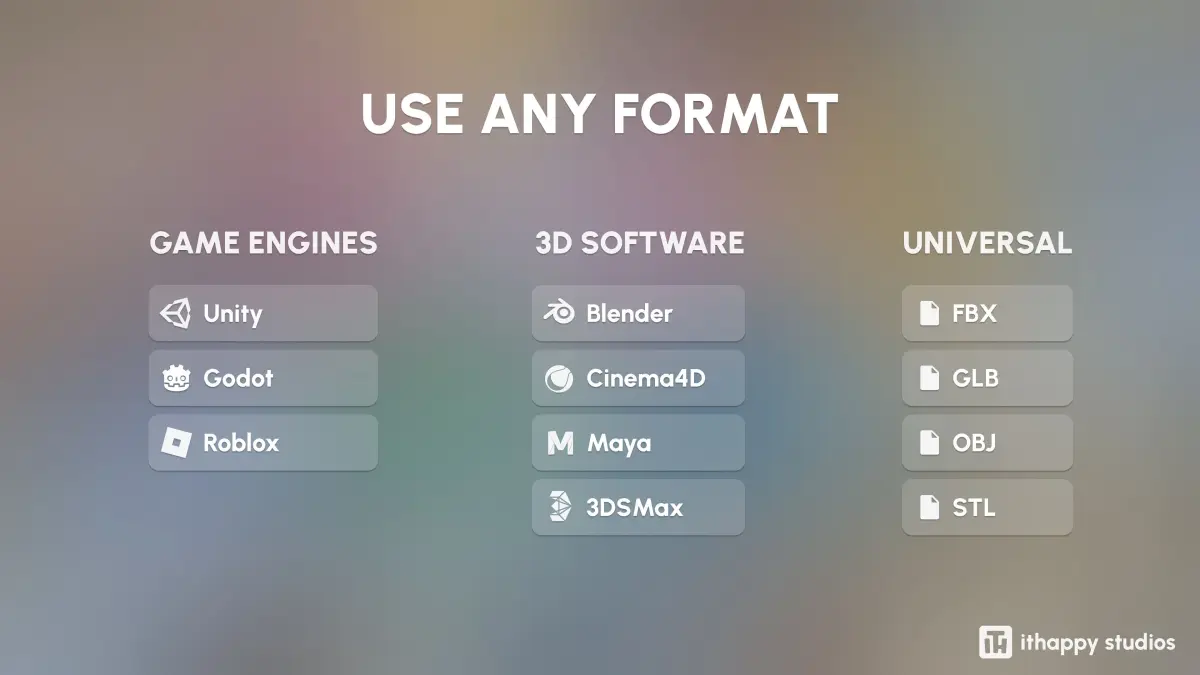 CHECK OUT OTHER PACKSFILESYou’ll be able to download formats such as Unity Package, UE, Blender, C4D, Maya, 3DSMax, FBX, OBJ, GLTF, and STL.