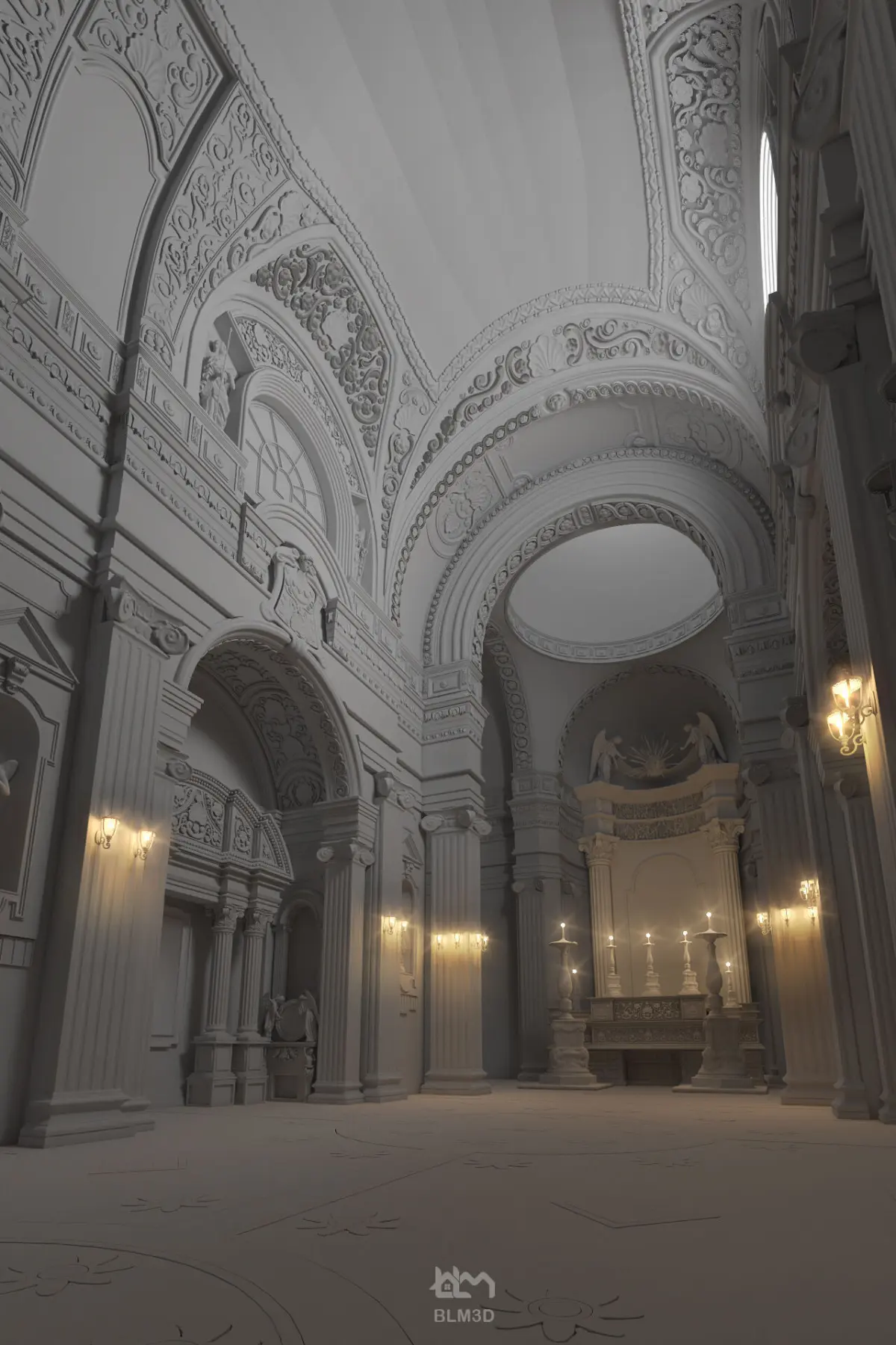 Highly detailed Baroque-style Cathedral Interior 3D scene, perfect for high-end architectural visualization, cinematic animation, and historical reconstructions.Model Features: