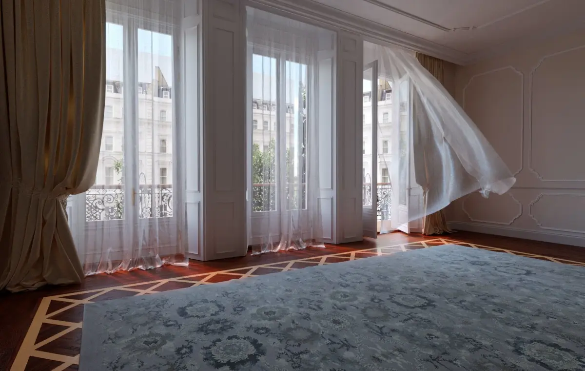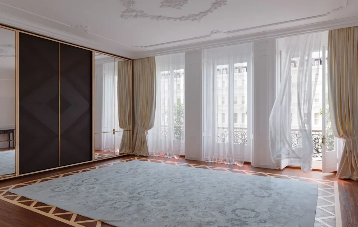 Interior scene The scene included - walls, wooden deco floor, windows, carpet Rugs - Gray, curtains (wind-emulated - 5 variations)wardrobe wall - mirror doors, ceiling and wall decor moldings, outside background