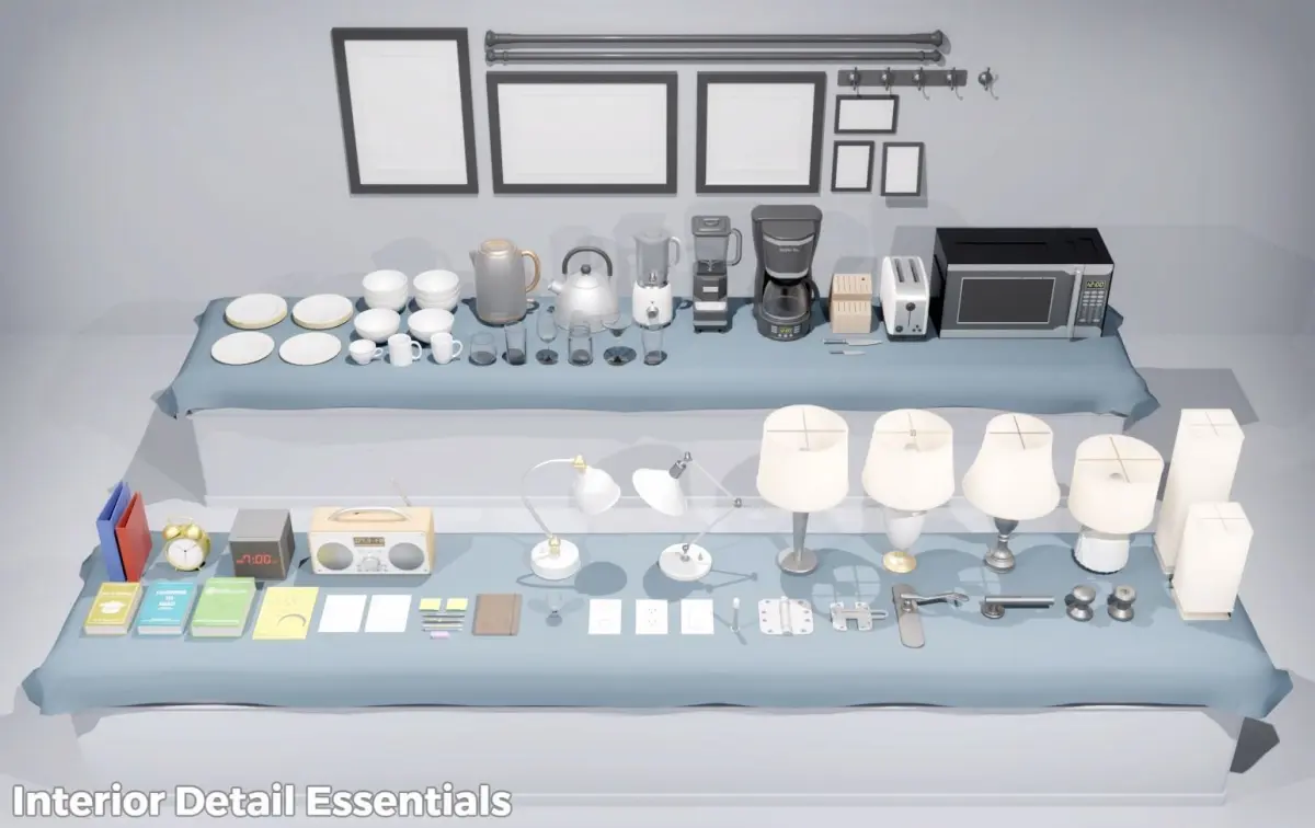 What is Interior Detail Essentials?Interior Detail Essentials is an all-in-one asset pack that helps you save time when constructing interior scenes. Drop in ready to go, customizable assets, saving a plethora of time and allowing you to better focus on the elements of your scene that matter the most. Optimize your workflow and elevate your projects to the next level!