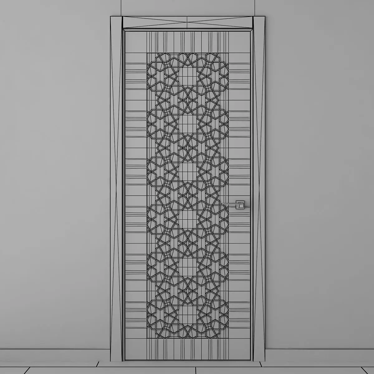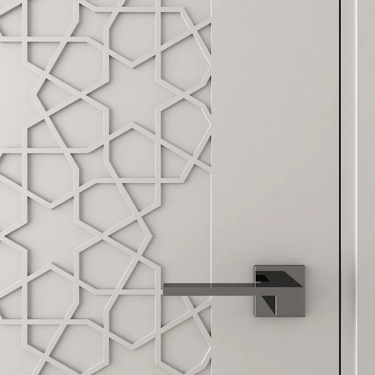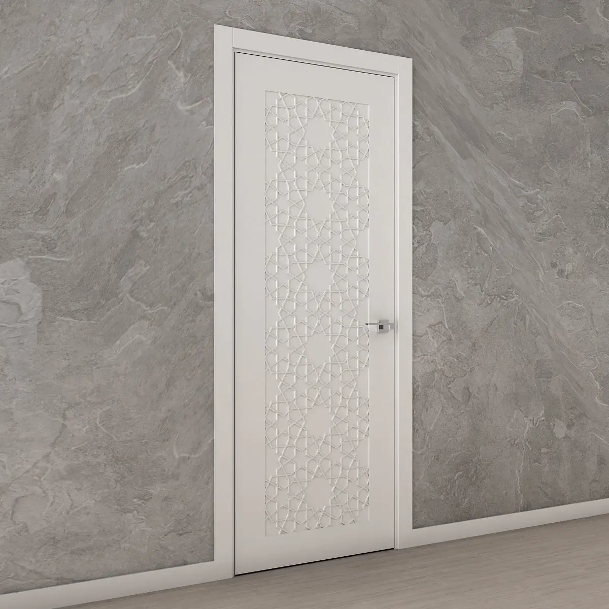 White interior door with Arabic carvings.You can use it as a decorative 3D panel.The size of the door leaf is 2100 x 800 x 35 mm.Prepared for high resolution realistic renders.Previews were rendered in 3ds Max 2018, Vray Next renderer.Lighting, cameras and studio setups are not included.