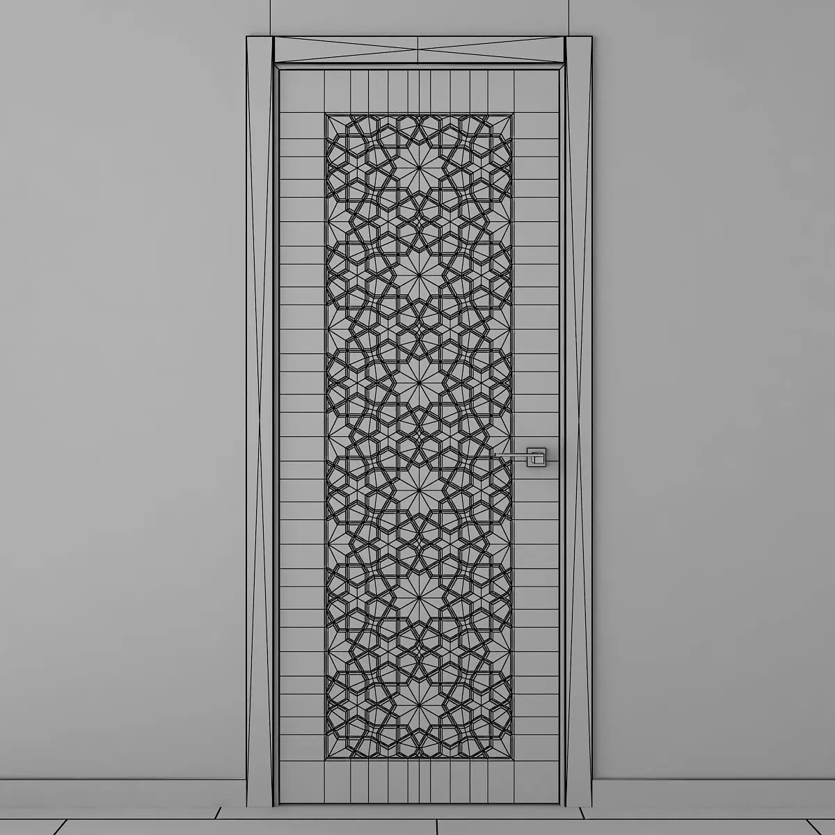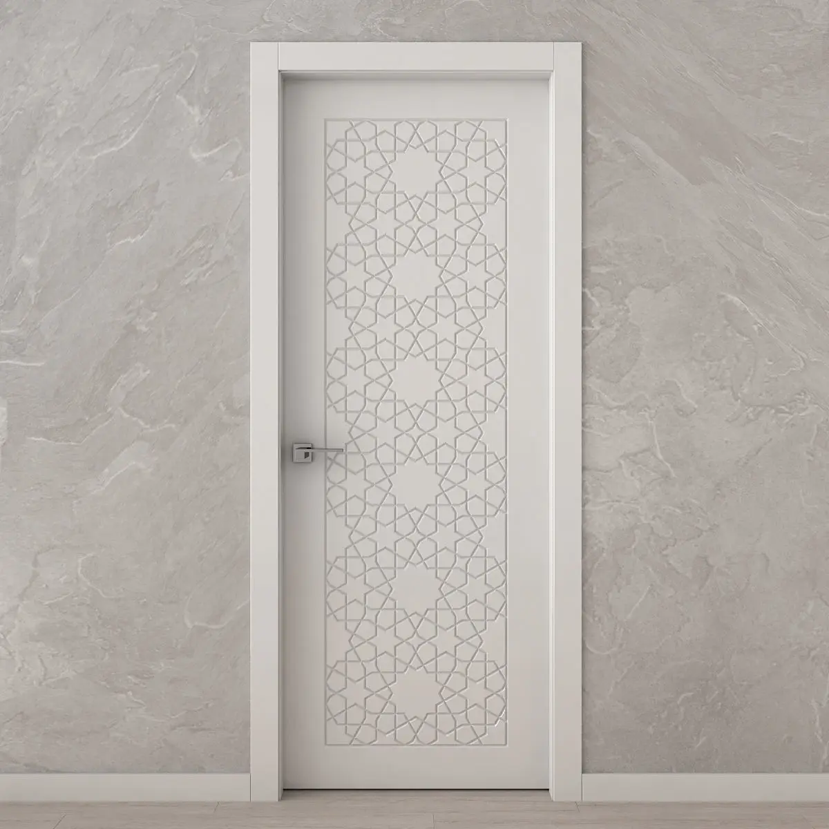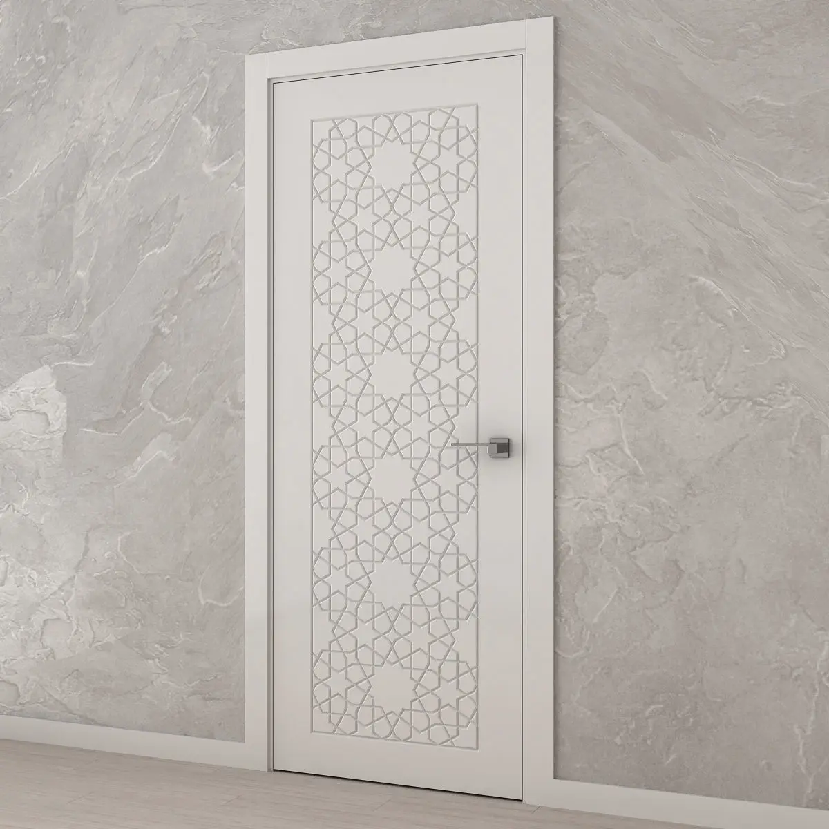 White interior door with Arabic carvings.You can use it as a decorative 3D panel.The size of the door leaf is 2100 x 800 x 35 mm.Prepared for high resolution realistic renders.Previews were rendered in 3ds Max 2018, Vray Next renderer.Lighting, cameras and studio setups are not included.