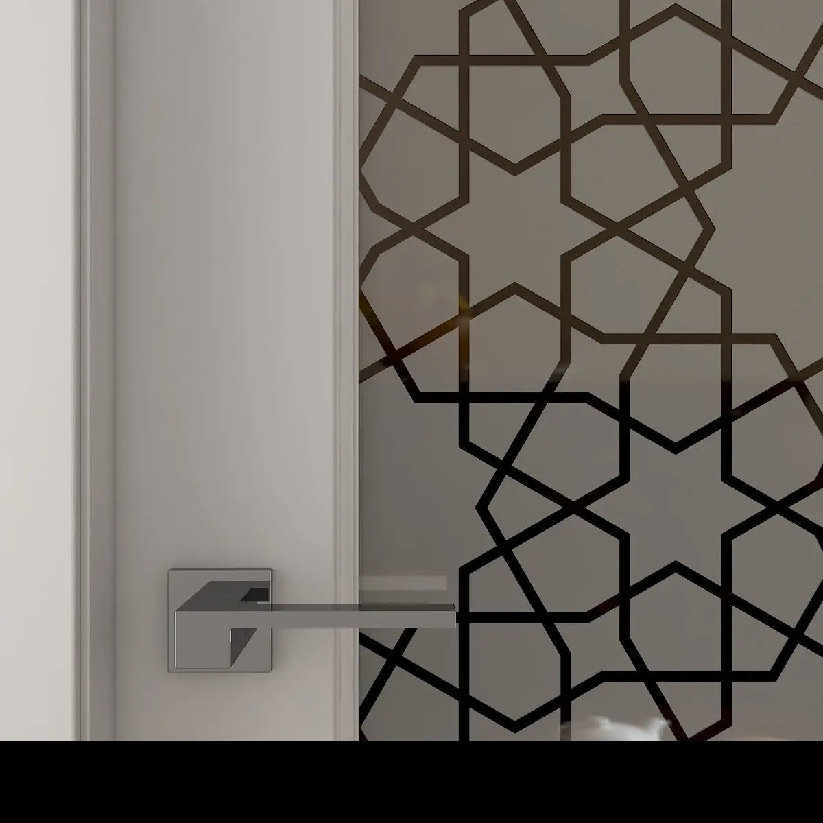 Interior door with treated glass in the form of an Arabian pattern.The size of the door leaf is 2100 x 800 x 35 mm.Prepared for high resolution realistic renders.Previews were rendered in 3ds Max 2018, Vray Next renderer.Lighting, cameras and studio setups are not included.