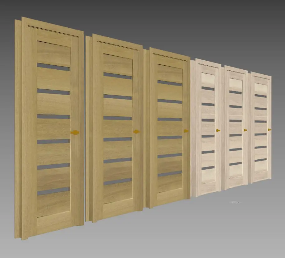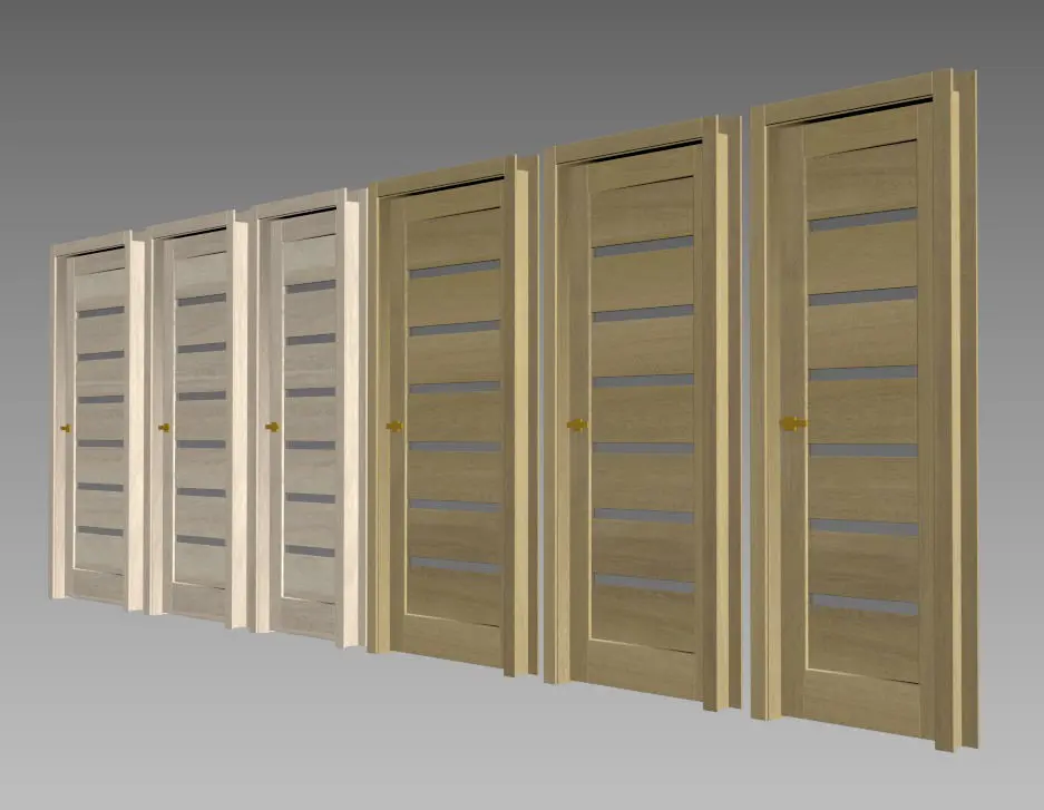 A set of interior doors in two colors: oak and gray oak.Sizes of door leaves:2000 x 700 x 40 mm,2000 x 800 x 40 mm,2000 x 900 x 40 mm.Prepared for high resolution realistic renders. Previews were rendered in 3ds Max 2015, Corona renderer.Lighting, cameras and studio setups are not included.