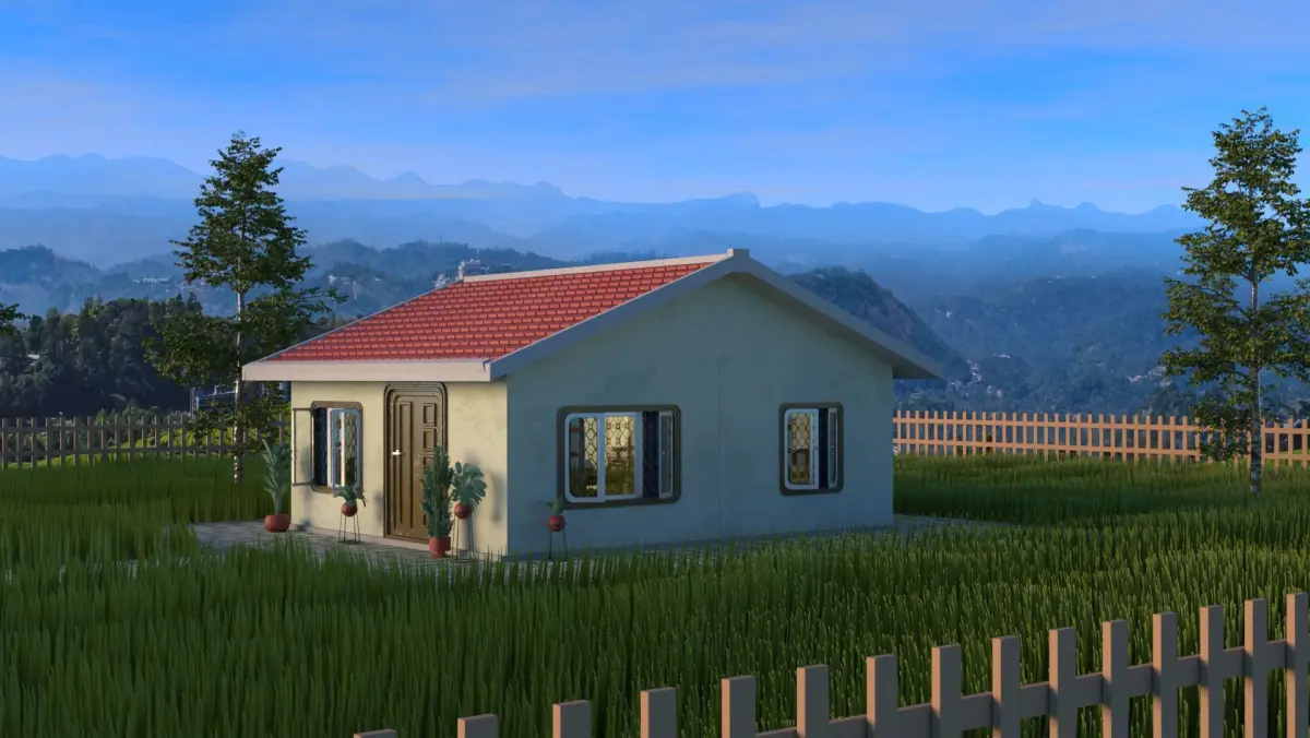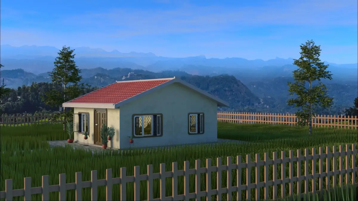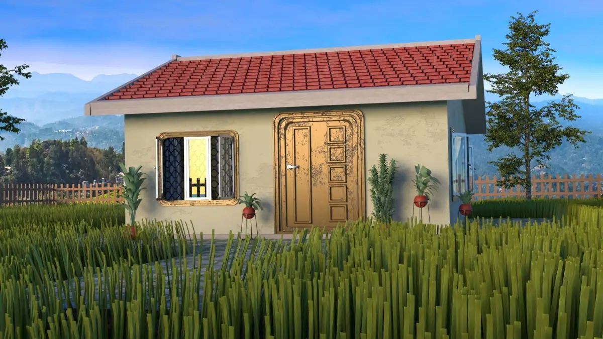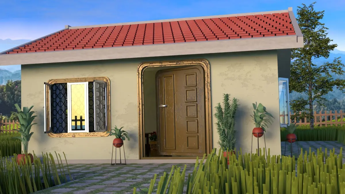 Inside the house :- sofa and teepoi, dining table & chairs, a cot with bed & pillow, and plant pots.