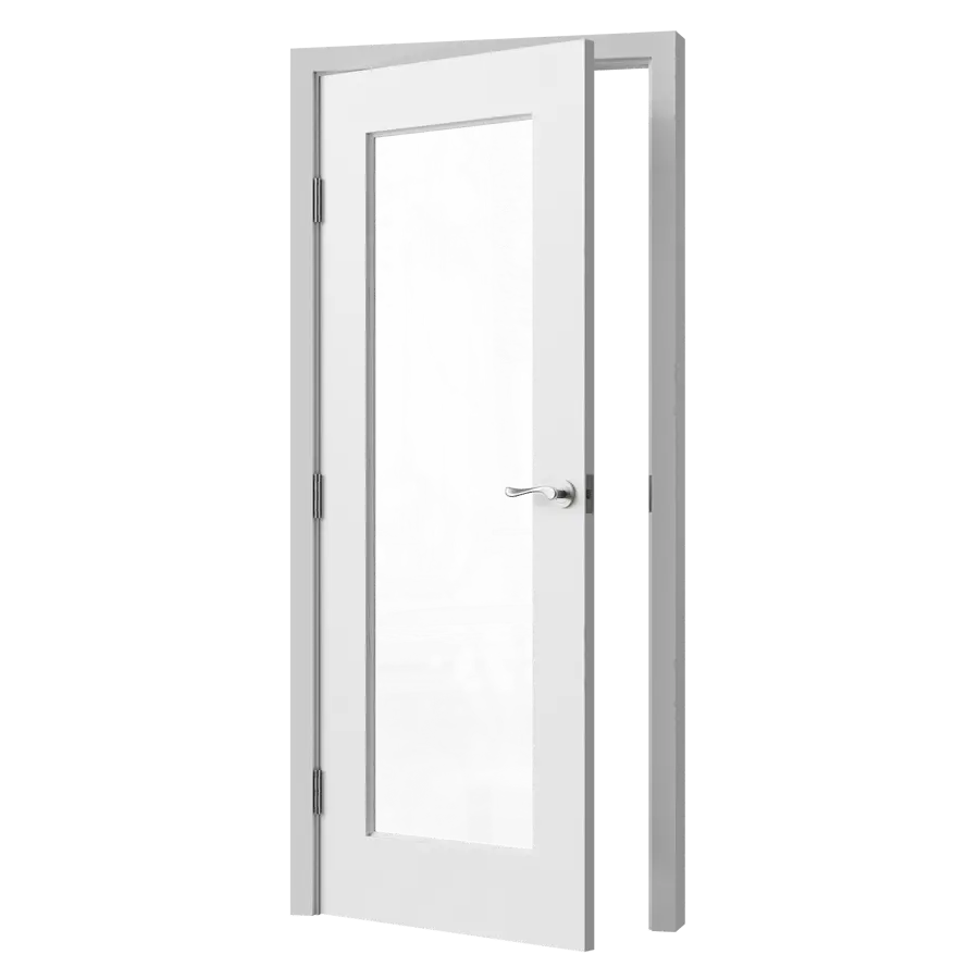 A hand modeled French single glass door with a white painted wooden frame with handles.