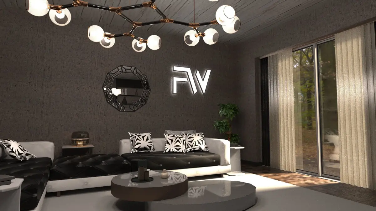 interior living room with fireplace and bookshelves 3D model