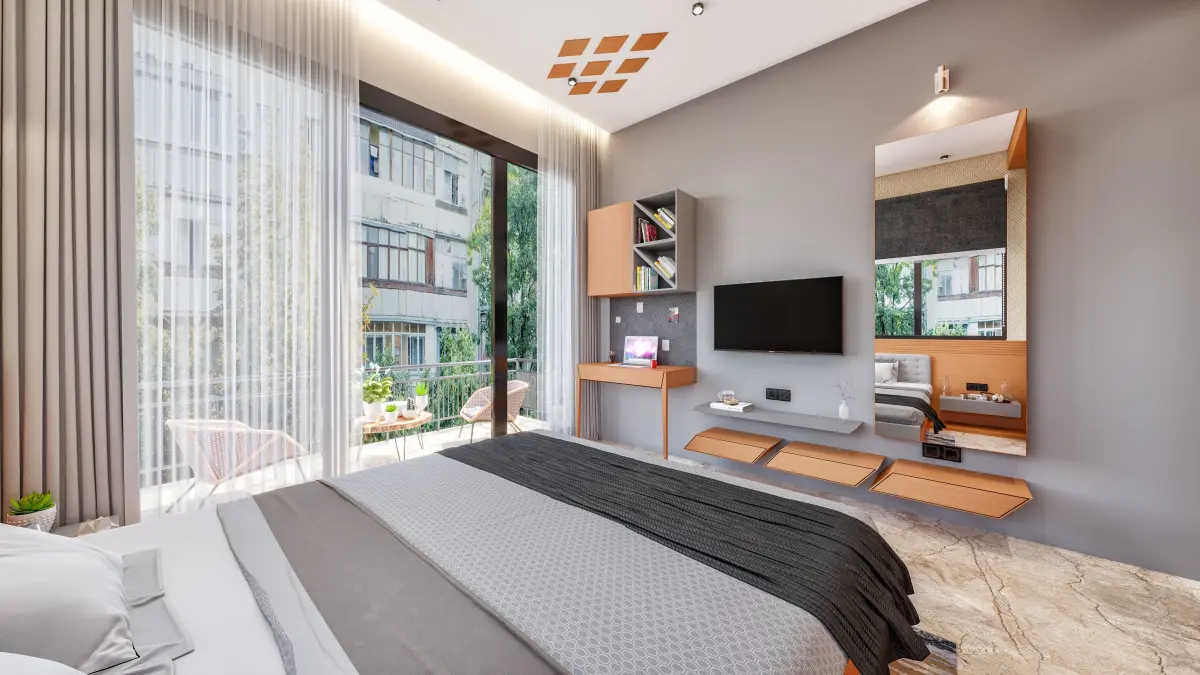 The significant combination of pattern and materials adds charm to modern design. The simple yet elegant design has a blend of Wooden Laminate and a Grey PU Finish. The clean-designed wooden veneer finish bed back has Grey PU finish sliders along with Grey Corian bed design. The Full Height Glass Sliding windows add natural light throughout the day which makes the room more lively. The TV Unit wall has a simple Grey Paint Wall Finish that has a veneer finish TV Unit along with Dressing on one side and a study unit on the other side.