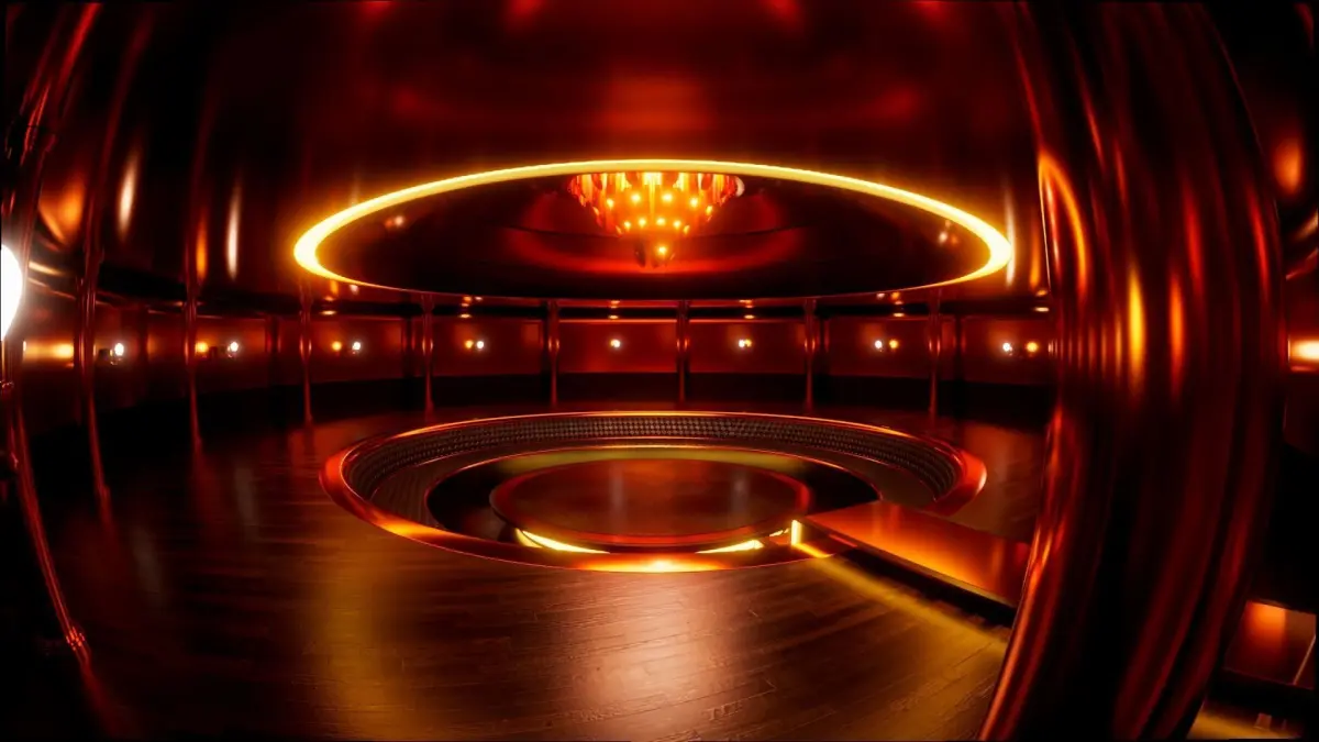 The interior is created in a round domed shape. Parquet floor. stairs made of golden material with illumination on the sides and inside. leather sofa upholstery. the table is also made of gold material and metal. massive heavy gilded chandelier with cutouts through which light passes from the top panel that glows. side illuminated corridor.