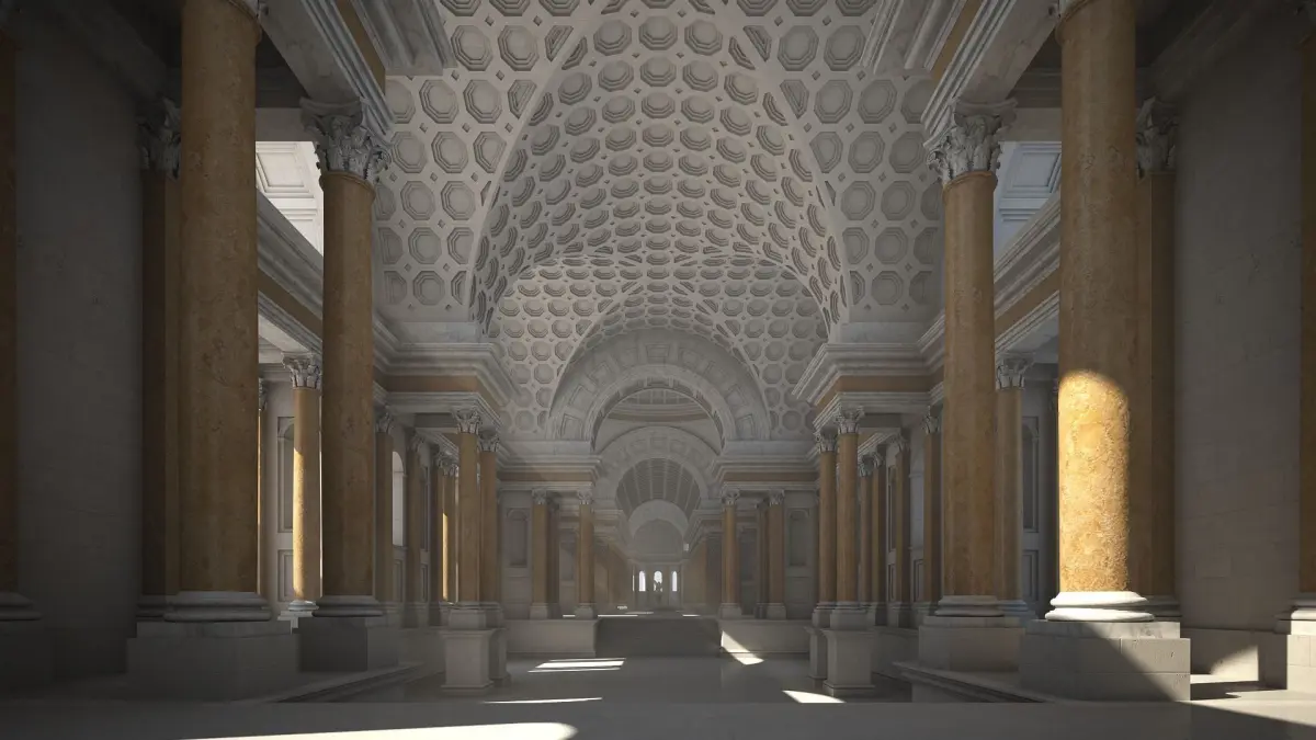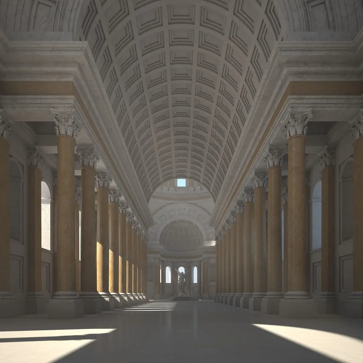 The model is fully textured with daylight system - vray sun and sky. Atmosferic effects obtained with VRay Environment Fog.The model is composed of different objects: column shaft, arches, vaults, cornices, entablatures, etc...
