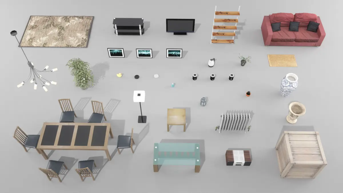 Wooden TableChairs (6)Glass Coffee TableCactusKettleCeiling LightMini Hi-fiFramed pictures (3)Coffee PotSugar PotTea PotRadiatorRubber DuckRugShelvesSide TableSoda CanSofaStanding Floor LampFloor PlantTable LampTable PlantTVTV StandVases (2)Welcome MatWooden Crate