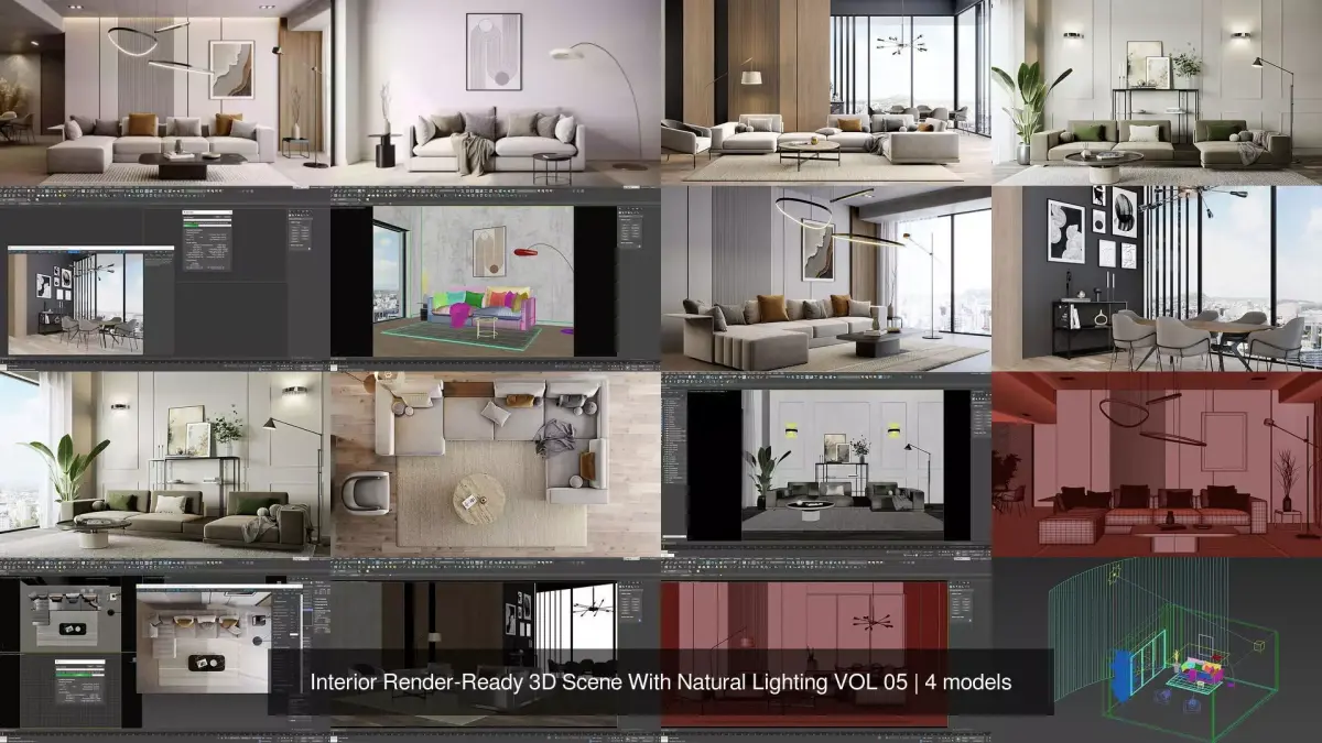 This premium interior pack includes 4 modern, bright living room scenes created in 3dsmax, fully set up with high-quality assets, natural lighting and pre-positioned cameras__ ready to render right out of the box.