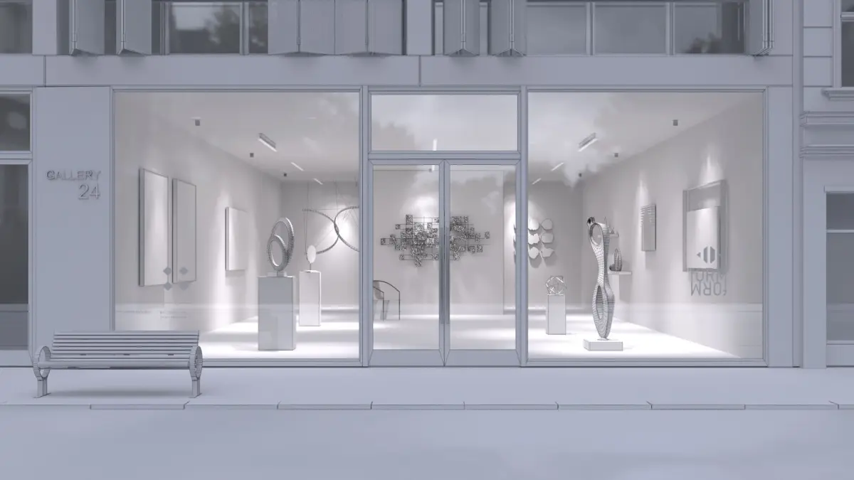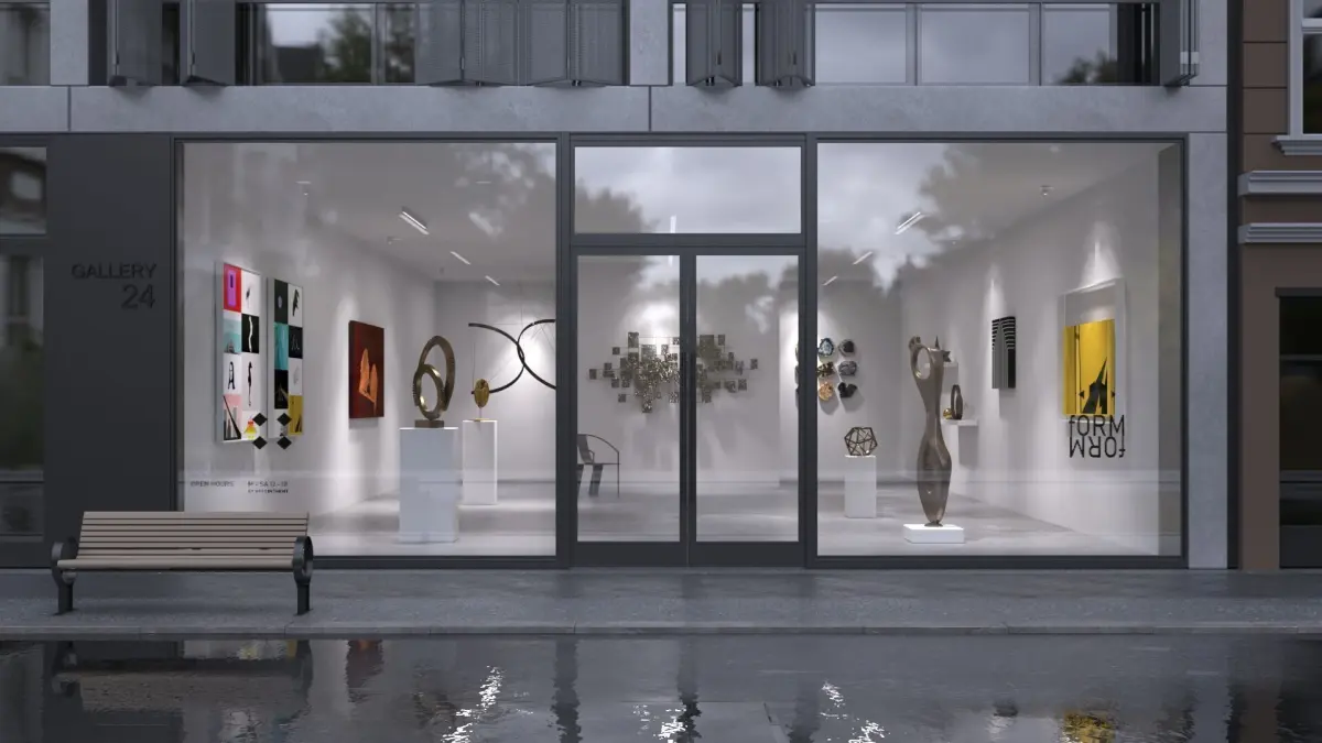Simple, small Art Gallery, trendy artwork and sculptures.