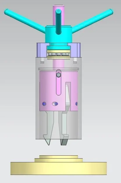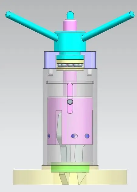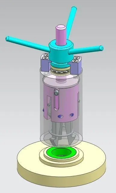It is an application of screw-nut drive for removing a bush (in green) out of a hole (in yellow).Three blue springs tend to turn out three blue hooksRed slider can’t rotate due to grey cross pin sliding in slots made on transparent cylinder.