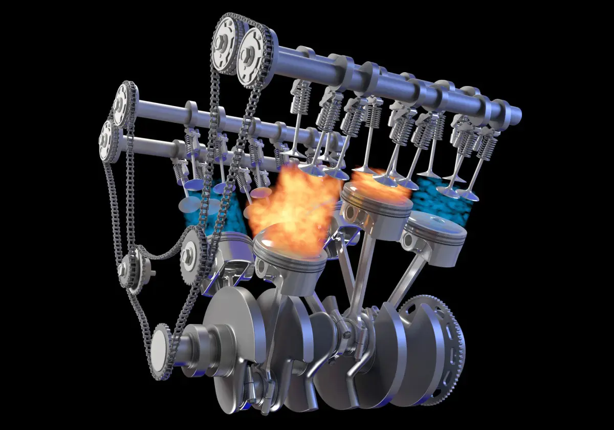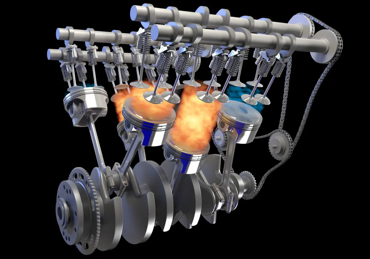 Animated 3d model of internal components of V6 engine with gasoline ignition effects.