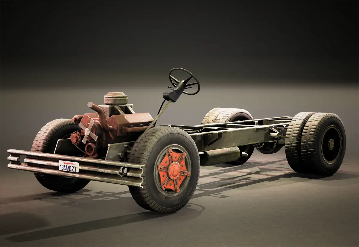 Game model. Real dimensions.57768 triss for whole model.4k texture for outside body and suspension ( 439 px/cm).4k texture for the first person (inside) ( 956 px/cm).2k texture for all wheels (414 px/cm).1k texture for glasses (595px/cm).There are primary baked textures ( Normal, AO, WSN, Curvature, ID, Position) and final textures ( Base Color, Roughness, Normal, Metallic, AO, Emissive).Maya, obj, fbx. Without LOD's. Non-triangulated meshes.Main renders in UE4.