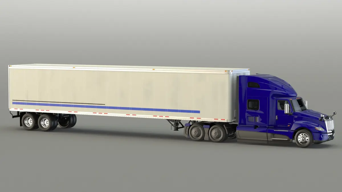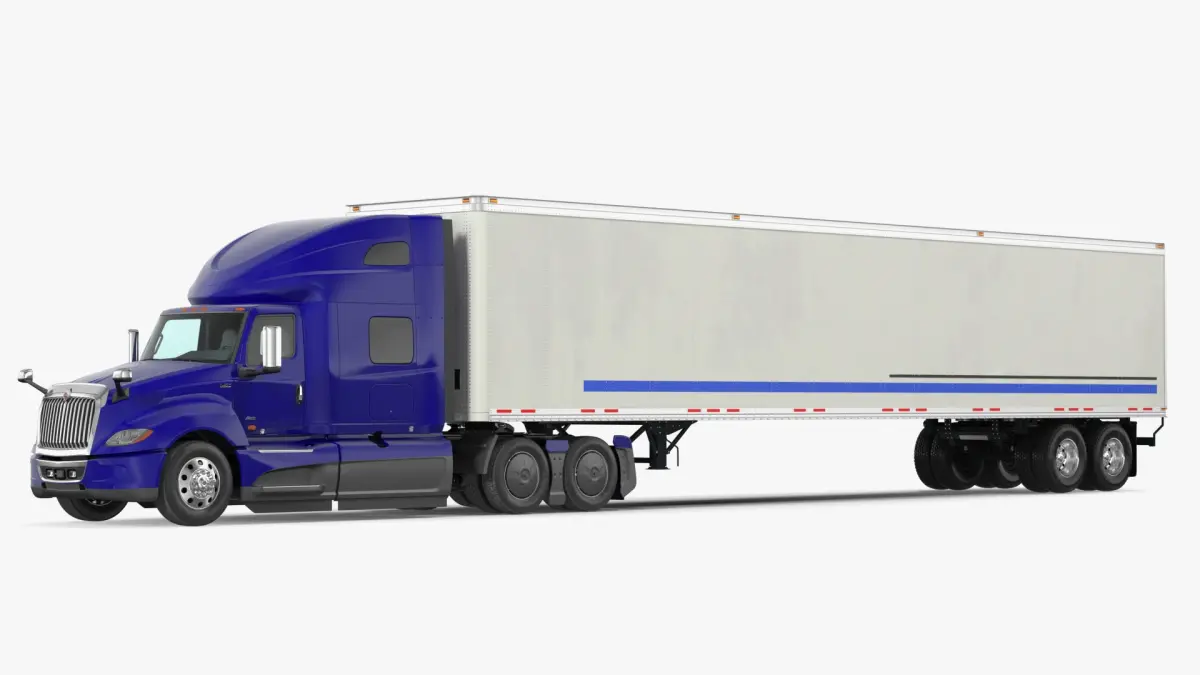 International LT625 blue Heavy Duty Truck with white Semi Trailer.