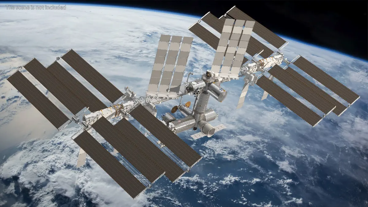 International Space Station is a three-dimensional model of a habitable artificial satellite in low Earth orbit which is a multinational collaborative project.